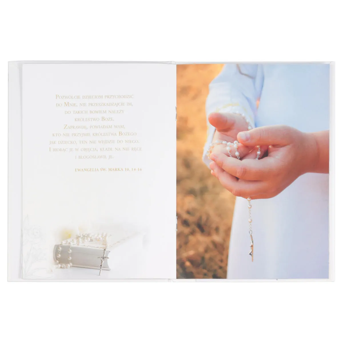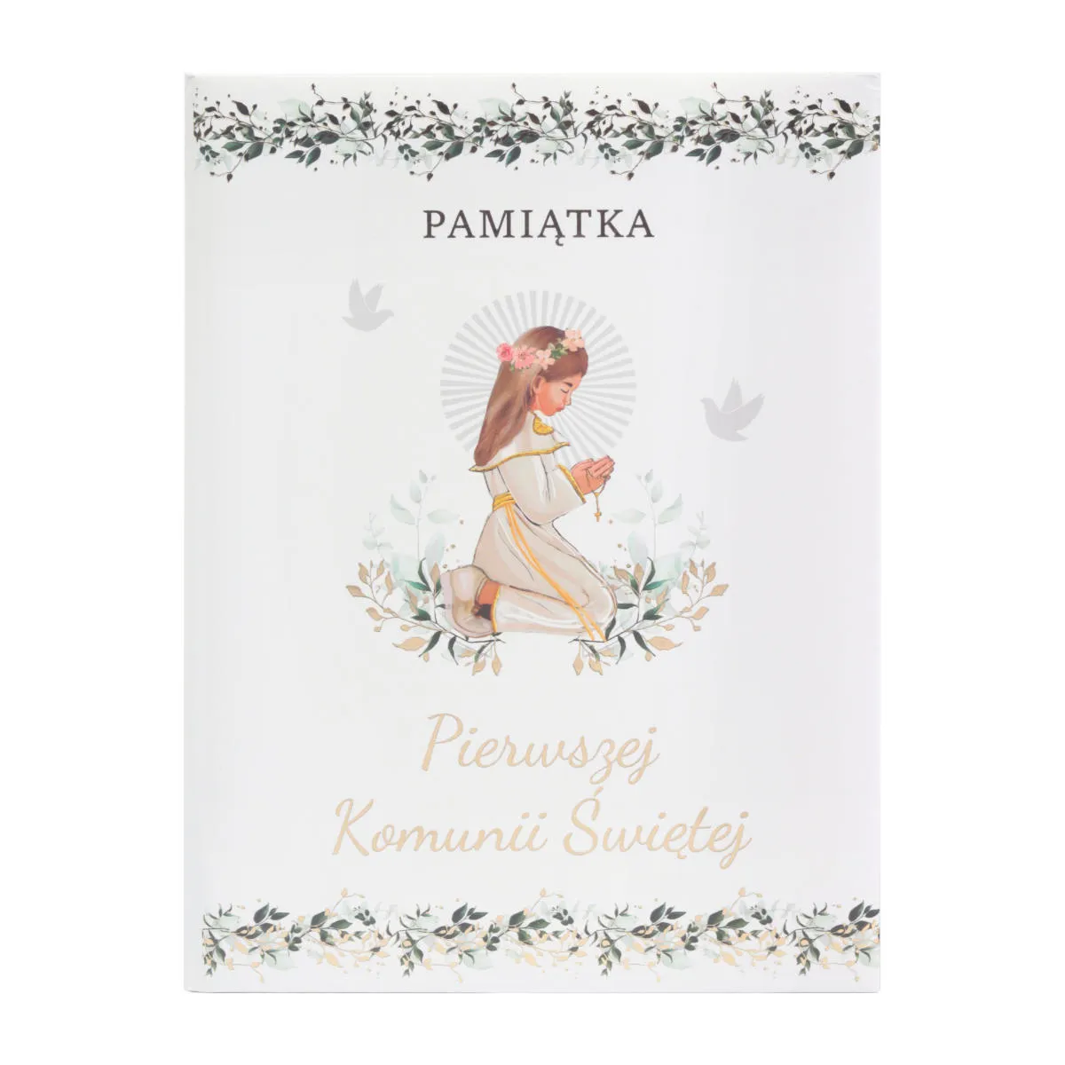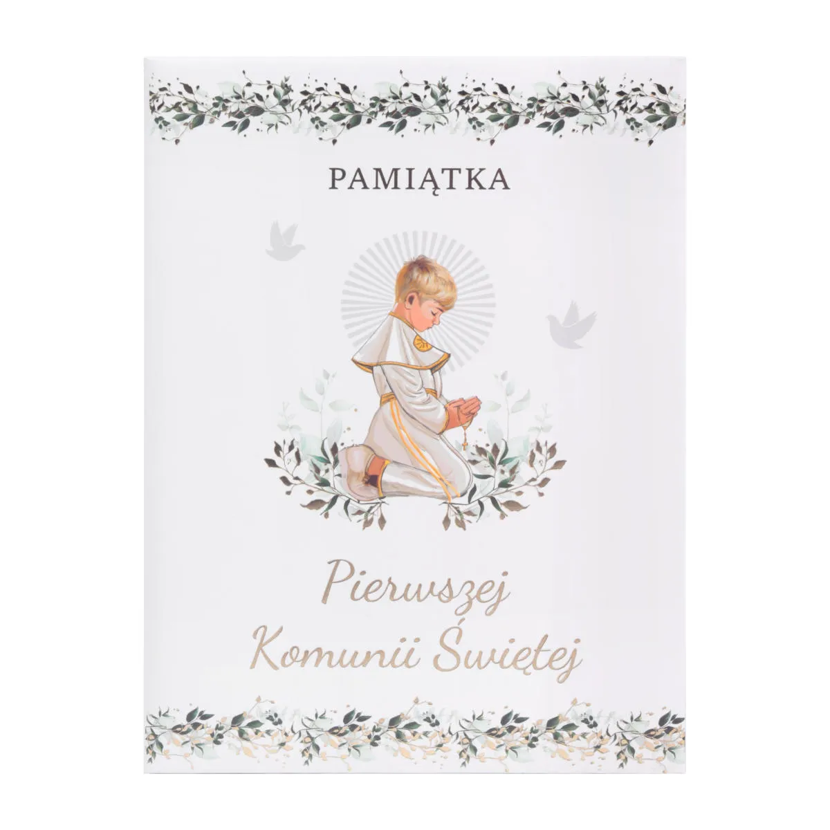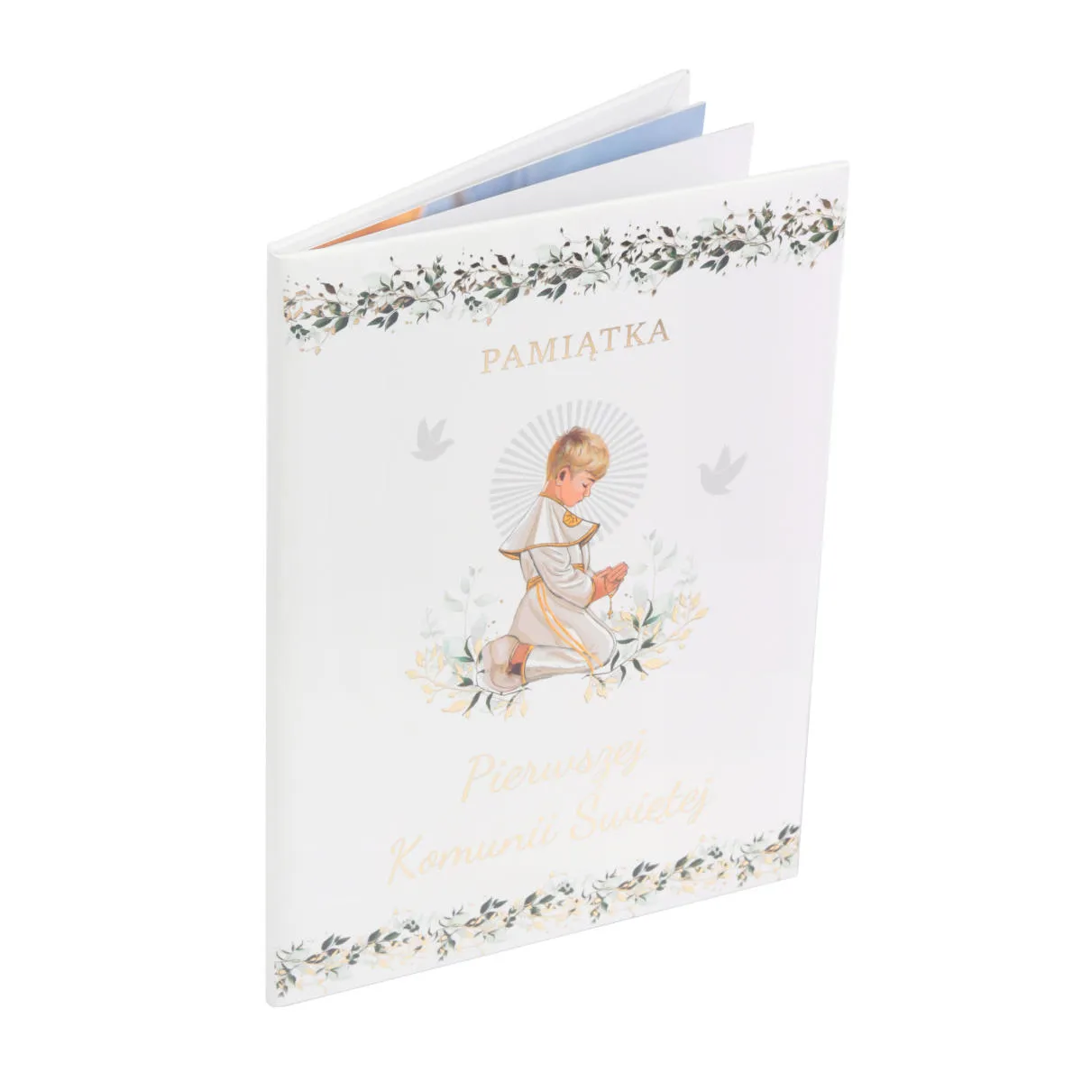 Pamiątka Pierwszej Komunii Świętej w formie albumu, w formacie A5. Książeczka ozdobiona roślinnymi motywami, wizerunkiem dziecka przystępującego do Sakramentu Komunii oraz złotym napisem. W środku książeczki znajdują się ilustrowane strony z kredowego papieru, życzenia, koperta podarunkowa oraz miejsce na pamiątkowe zdjęcie. Jest także strona na personalizację. Album jest dostępny w dwóch wzorach do wyboru. Podana cena dotyczy 1 sztuki z wybranego wzoru.
