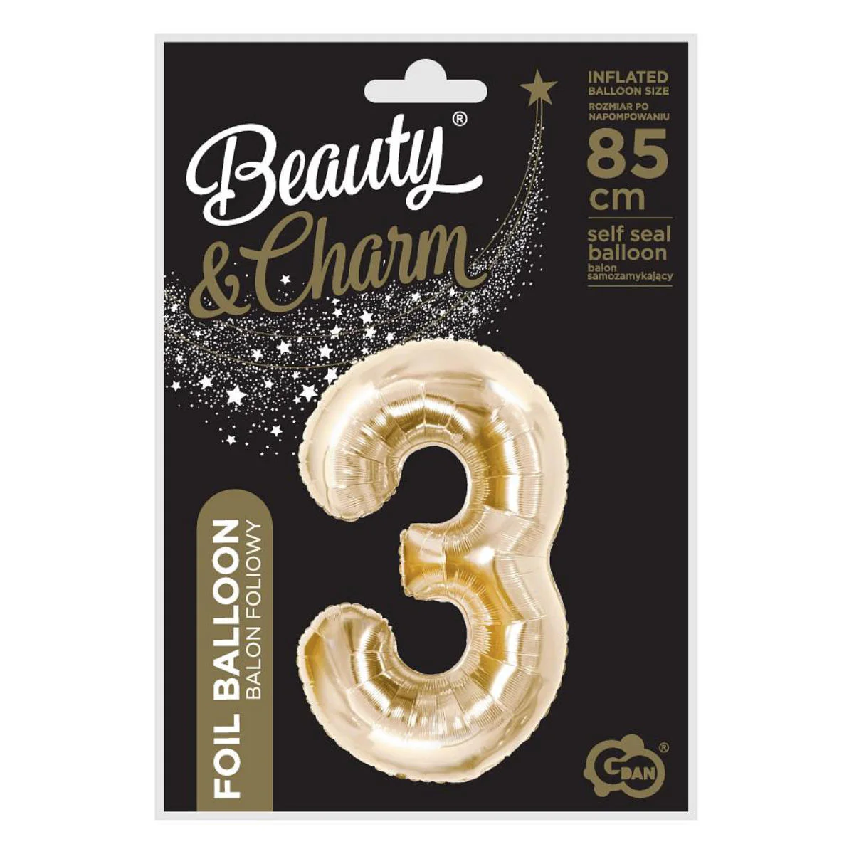 Balon foliowy w kształcie cyfry trzy w kolorze szampana, do samodzielnego napełnienia helem lub powietrzem. Balon unosi się po napełnieniu helem i wyposażony jest w wygodny system samozamykający, więc nie musimy obawiać się uciekającego powietrza. Balon po napełnieniu ma wysokość ok. 85cm.
