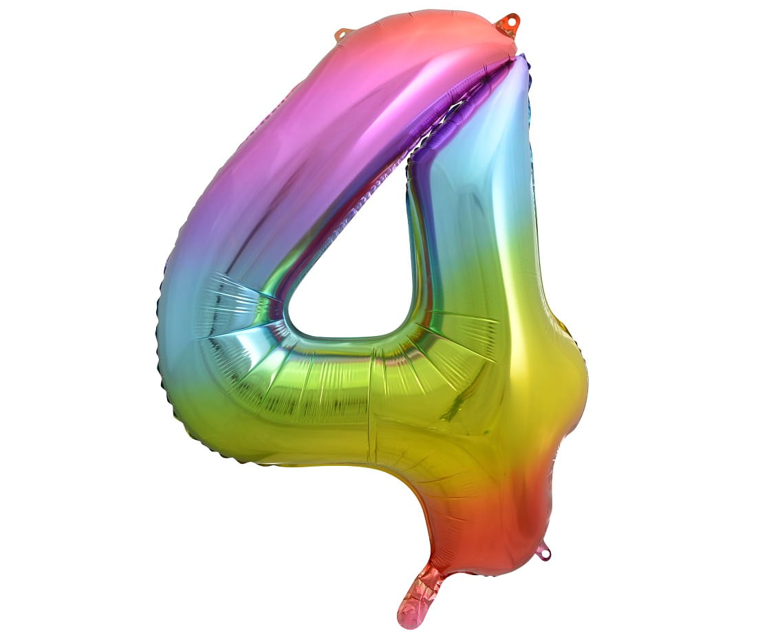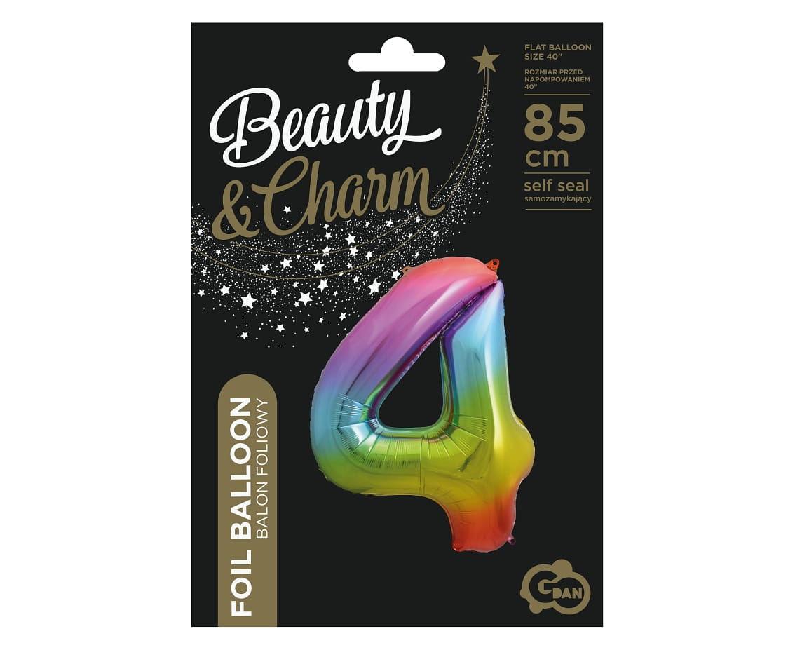 Balon foliowy w kształcie cyfry cztery w tęczowych barwach, do samodzielnego napełnienia helem lub powietrzem. Balon unosi się po napełnieniu helem i wyposażony jest w wygodny system samozamykający, więc nie musimy obawiać się uciekającego powietrza. Balon po napełnieniu ma wysokość ok. 85cm.