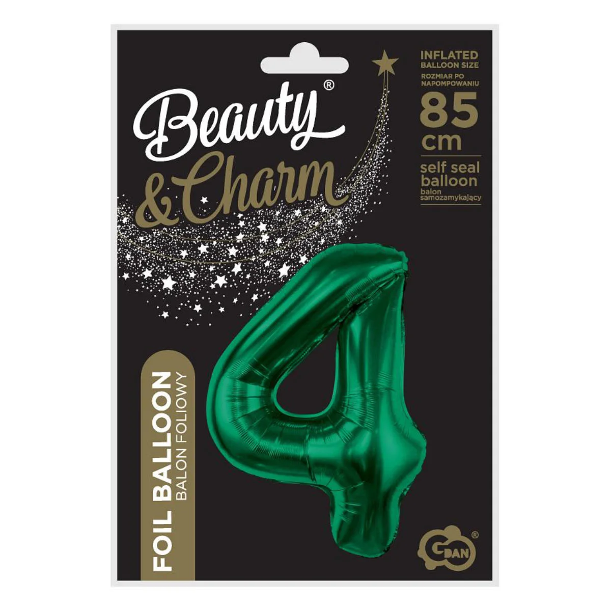 Duży, urodzinowy balon foliowy z kolekcji Beauty&Charm, w kształcie cyfry cztery w kolorze butelkowej zieleni. Balon do samodzielnego napełnienia helem lub powietrzem. Unosi się po napełnieniu helem i wyposażony jest w wygodny system samozamykający, zabezpieczający przed uciekaniem powietrza. Balon po napełnieniu ma wysokość ok. 85cm. Wykonany jest z wytrzymałej folii i idealnie nadaje się na centralny element dekoracji balonowej lub jako samodzielna ozdoba. Aby napełnić balon powietrzem, wystarczy rurkę (słomkę) włożyć do otworu napełniania i go nadmuchać. Można również użyć pompki do balonów.