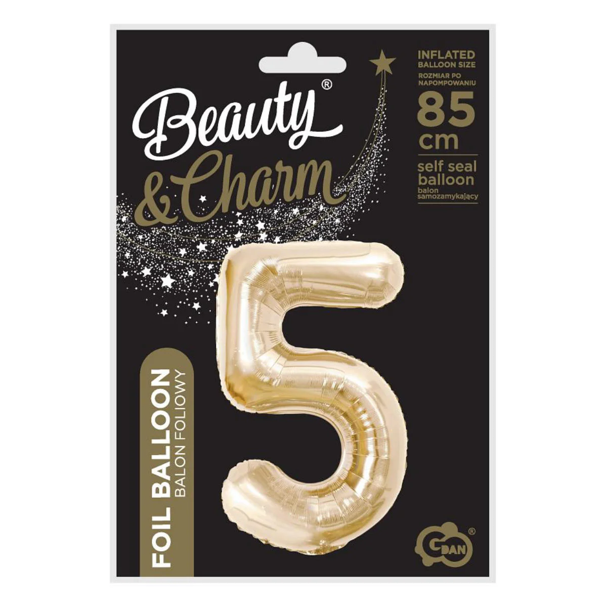 Balon foliowy w kształcie cyfry pięć w kolorze szampana, do samodzielnego napełnienia helem lub powietrzem. Balon unosi się po napełnieniu helem i wyposażony jest w wygodny system samozamykający, zabezpieczający przed uciekaniem powietrza. Balon po napełnieniu ma wysokość ok. 85cm.
