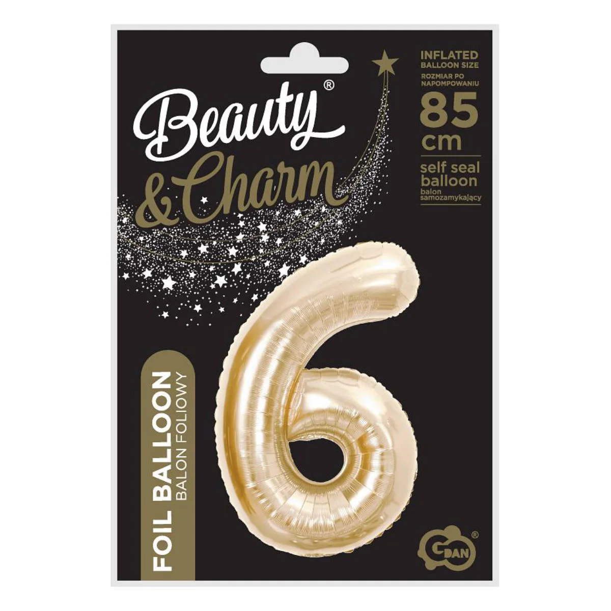 Balon foliowy w kształcie cyfry sześć w kolorze szampana, do samodzielnego napełnienia helem lub powietrzem. Balon unosi się po napełnieniu helem i wyposażony jest w wygodny system samozamykający, zabezpieczający przed uciekaniem powietrza. Balon po napełnieniu ma wysokość ok. 85cm.