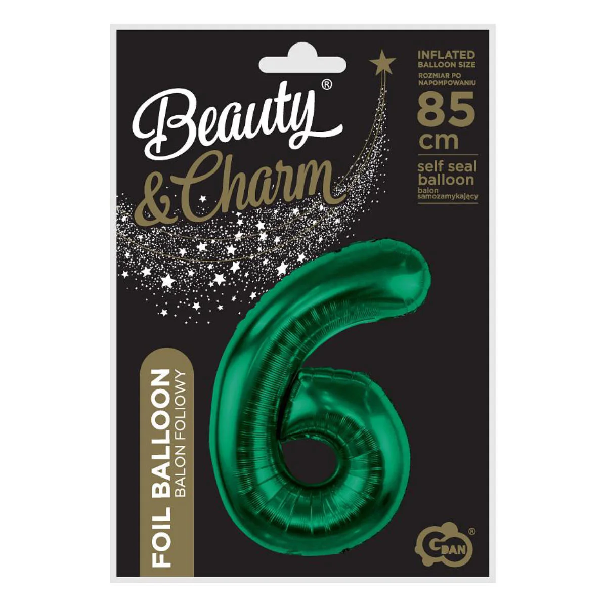 Duży, urodzinowy balon foliowy z kolekcji Beauty&Charm, w kształcie cyfry sześć w kolorze butelkowej zieleni. Balon do samodzielnego napełnienia helem lub powietrzem. Unosi się po napełnieniu helem i wyposażony jest w wygodny system samozamykający, zabezpieczający przed uciekaniem powietrza. Balon po napełnieniu ma wysokość ok. 85cm. Wykonany jest z wytrzymałej folii i idealnie nadaje się na centralny element dekoracji balonowej lub jako samodzielna ozdoba. Aby napełnić balon powietrzem, wystarczy rurkę (słomkę) włożyć do otworu napełniania i go nadmuchać. Można również użyć pompki do balonów.