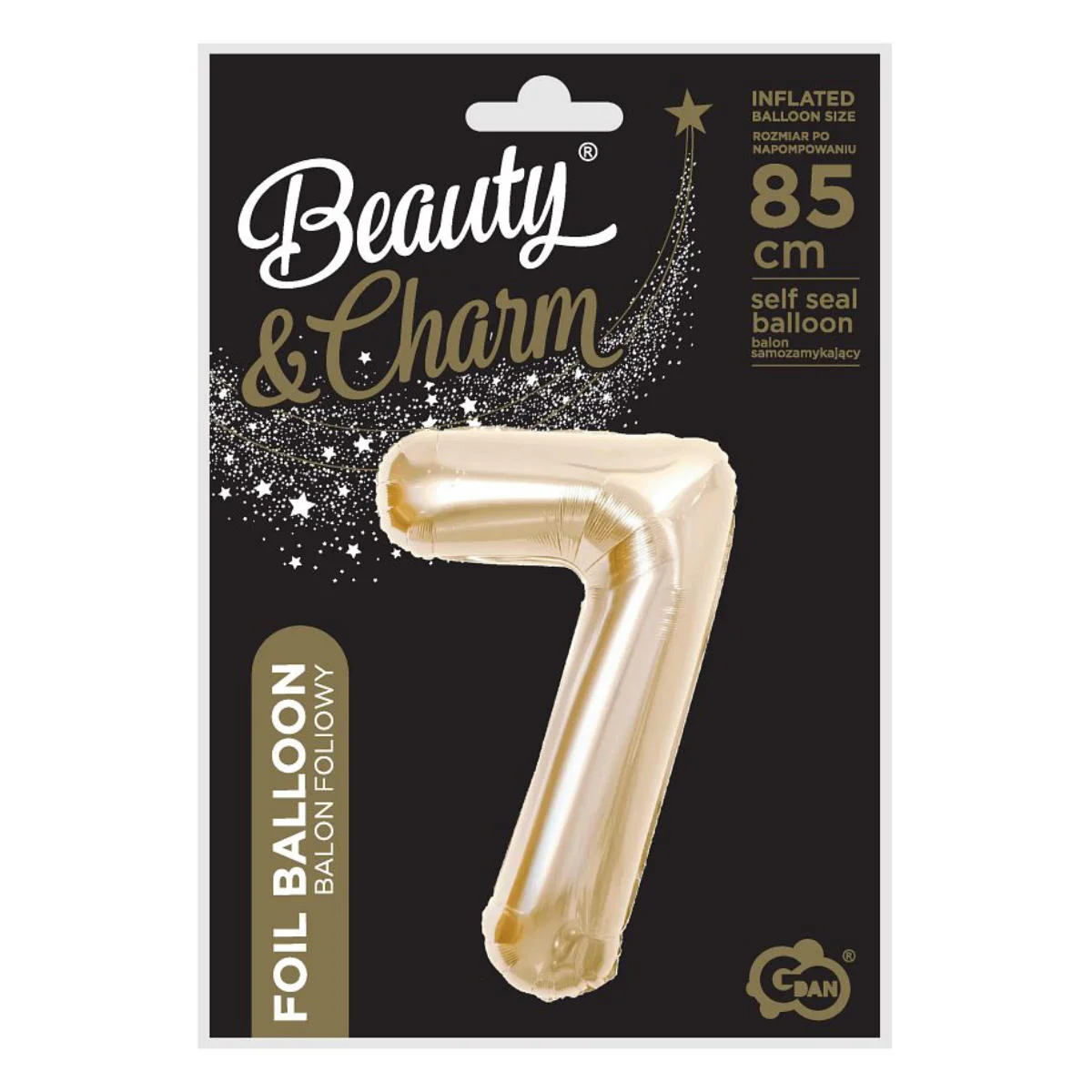 Balon foliowy w kształcie cyfry siedem w kolorze szampana, do samodzielnego napełnienia helem lub powietrzem. Balon unosi się po napełnieniu helem i wyposażony jest w wygodny system samozamykający, zabezpieczający przed uciekaniem powietrza. Balon po napełnieniu ma wysokość ok. 85cm.