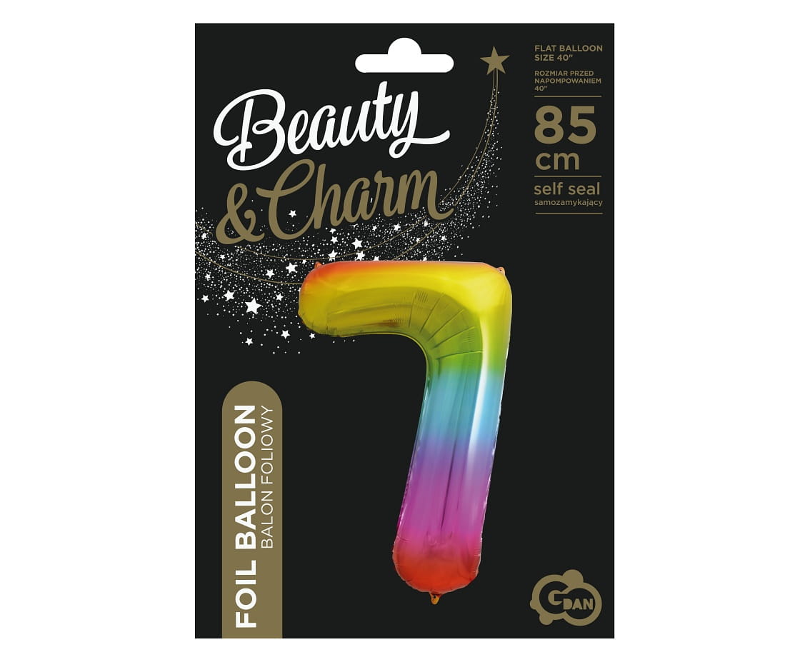 Balon foliowy w kształcie cyfry siedem w tęczowych barwach, do samodzielnego napełnienia helem lub powietrzem. Balon unosi się po napełnieniu helem i wyposażony jest w wygodny system samozamykający, więc nie musimy obawiać się uciekającego powietrza. Balon po napełnieniu ma wysokość ok. 85cm.