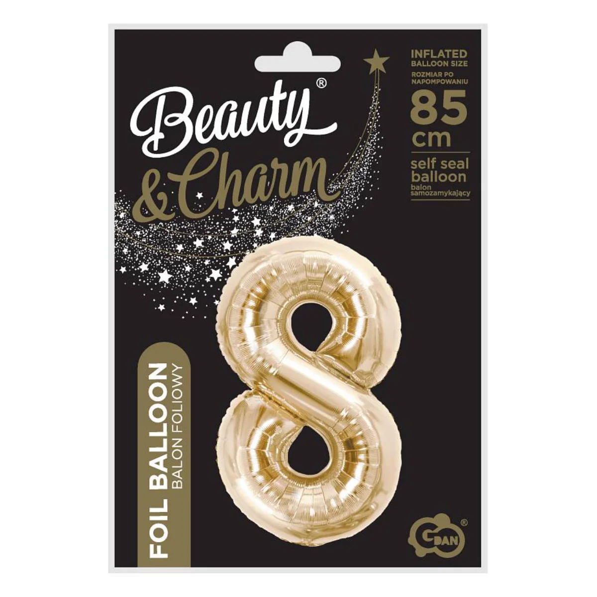 Balon foliowy w kształcie cyfry osiem w kolorze szampana, do samodzielnego napełnienia helem lub powietrzem. Balon unosi się po napełnieniu helem i wyposażony jest w wygodny system samozamykający, zabezpieczający przed uciekaniem powietrza. Balon po napełnieniu ma wysokość ok. 85cm.