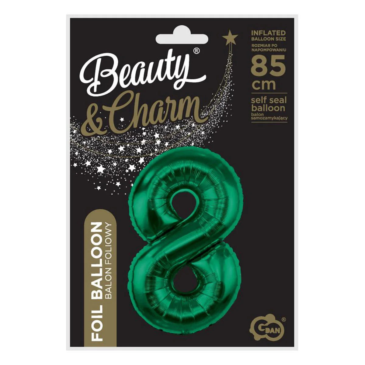 Duży, urodzinowy balon foliowy z kolekcji Beauty&Charm, cyfra osiem w kolorze butelkowej zieleni. Balon do samodzielnego napełnienia helem lub powietrzem. Unosi się po napełnieniu helem i wyposażony jest w wygodny system samozamykający, zabezpieczający przed uciekaniem powietrza. Balon po napełnieniu ma wysokość ok. 85cm. Wykonany jest z wytrzymałej folii i idealnie nadaje się na centralny element dekoracji balonowej lub jako samodzielna ozdoba. Aby napełnić balon powietrzem, wystarczy rurkę (słomkę) włożyć do otworu napełniania i go nadmuchać. Można również użyć pompki do balonów.