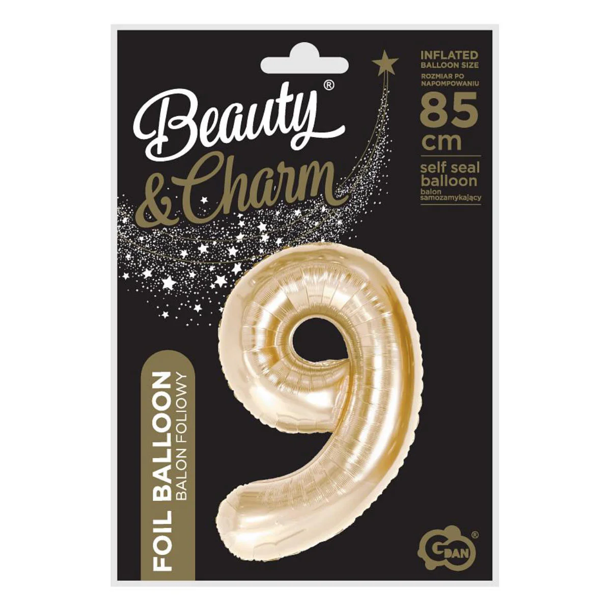 Balon foliowy w kształcie cyfry dziewięć w kolorze szampana, do samodzielnego napełnienia helem lub powietrzem. Balon unosi się po napełnieniu helem i wyposażony jest w wygodny system samozamykający, zabezpieczający przed uciekaniem powietrza. Balon po napełnieniu ma wysokość ok. 85cm.