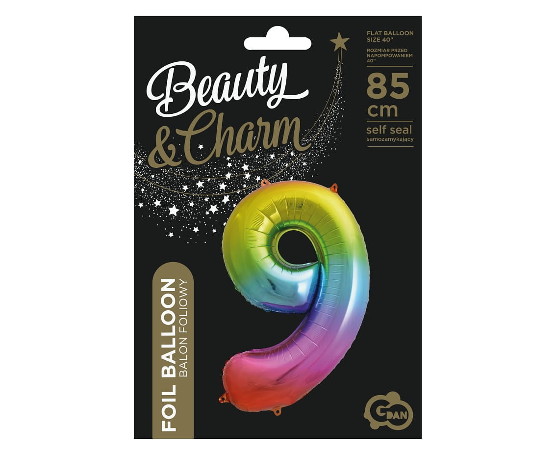 Balon foliowy w kształcie cyfry dziewięć w tęczowych barwach, do samodzielnego napełnienia helem lub powietrzem. Balon unosi się po napełnieniu helem i wyposażony jest w wygodny system samozamykający, więc nie musimy obawiać się uciekającego powietrza. Balon po napełnieniu ma wysokość ok. 85cm.