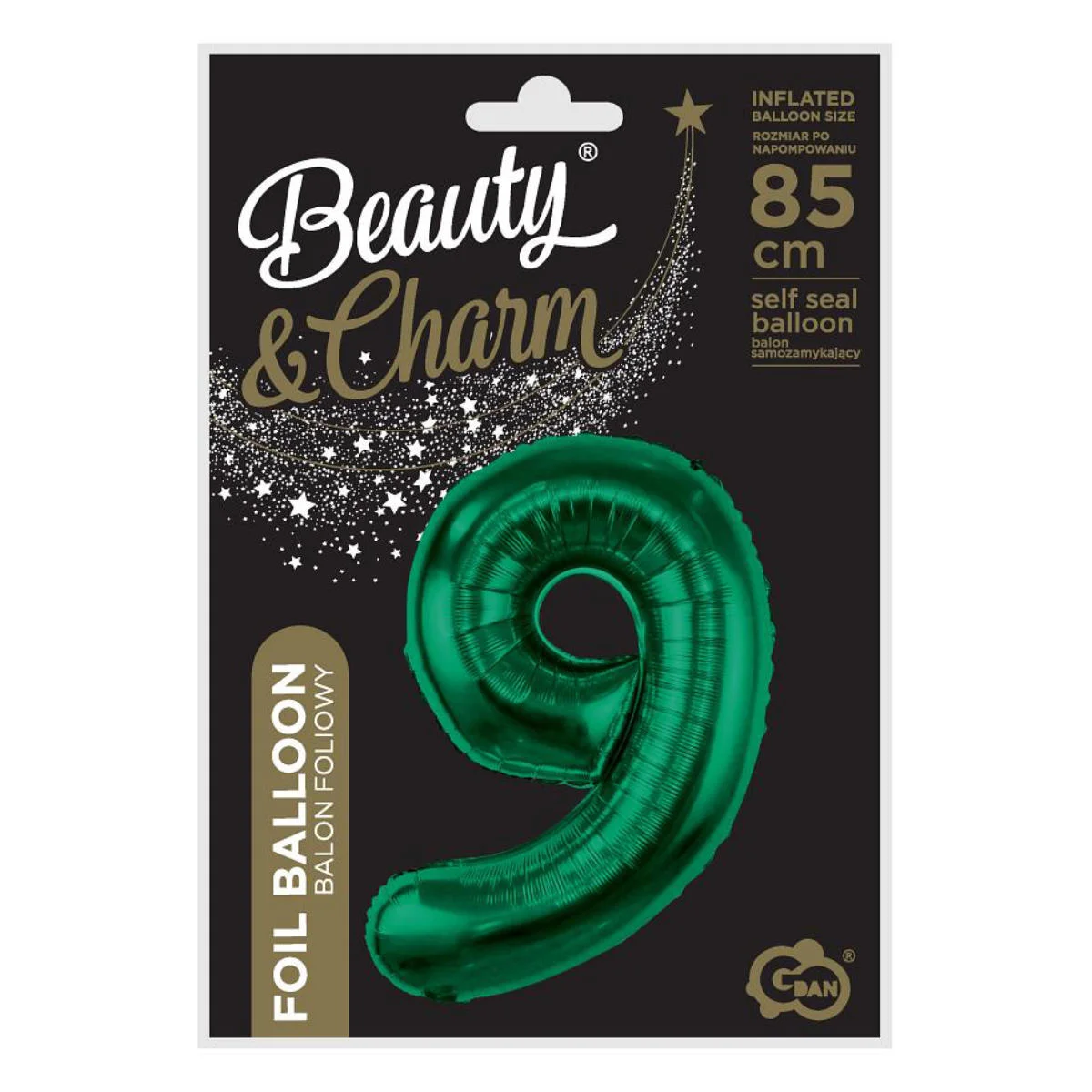 Balon foliowy z kolekcji Beauty&Charm, w kształcie cyfry dziewięć w kolorze butelkowej zieleni. Idealny na urodziny i rocznice. Balon do samodzielnego napełnienia helem lub powietrzem. Unosi się po napełnieniu helem i wyposażony jest w wygodny system samozamykający, zabezpieczający przed uciekaniem powietrza. Balon po napełnieniu ma wysokość ok. 85cm. Wykonany jest z wytrzymałej folii i idealnie nadaje się na centralny element dekoracji balonowej lub jako samodzielna ozdoba.