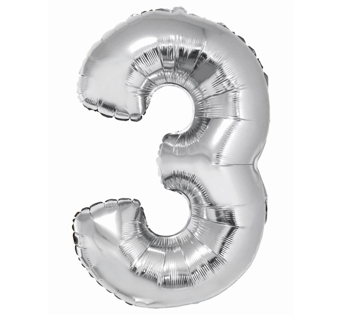 Balon foliowy w kształcie cyfry trzy w kolorze srebrnym. Balon do samodzielnego napełnienia helem lub powietrzem. Unosi się po napełnieniu helem i wyposażony jest w wygodny system samozamykający, zabezpieczający przed uciekaniem powietrza. Balon po napełnieniu ma wysokość ok. 92cm. Wykonany jest z wytrzymałej folii, a jego wymiary powodują, że idealnie nadaje się na centralny element dekoracji balonowej lub jako samodzielna ozdoba.