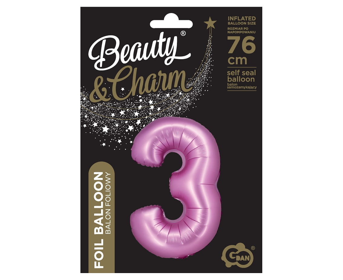 Balon foliowy w kształcie cyfry trzy, w kolorze różowym, do samodzielnego napełnienia. Balon unosi się po napełnieniu helem i wyposażony jest w wygodny system samozamykający, więc nie musimy obawiać się uciekającego powietrza.