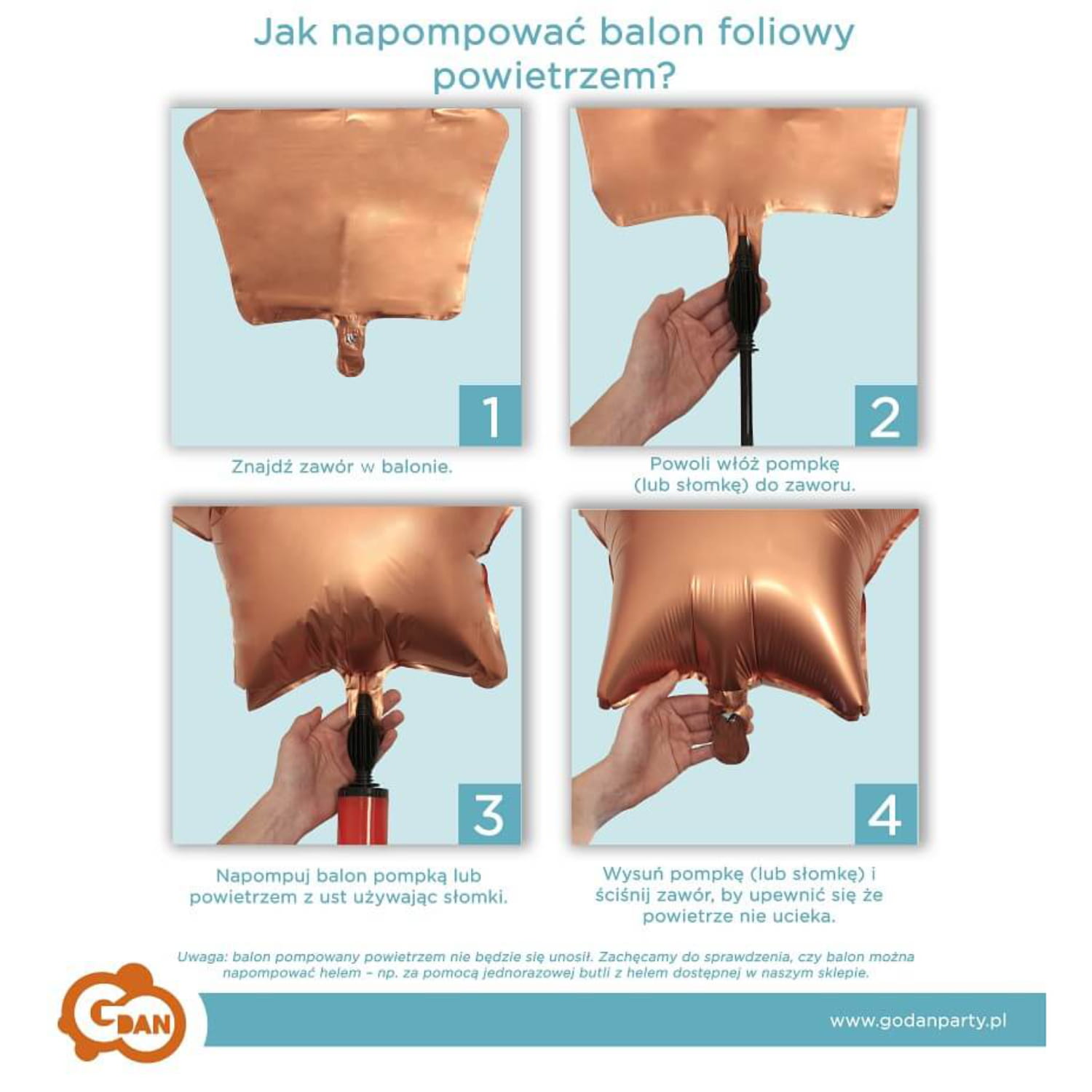 Balon do samodzielnego napełnienia helem lub powietrzem. Unosi się po napełnieniu helem i wyposażony jest w wygodny system samozamykający, więc nie musimy obawiać się uciekającego powietrza.