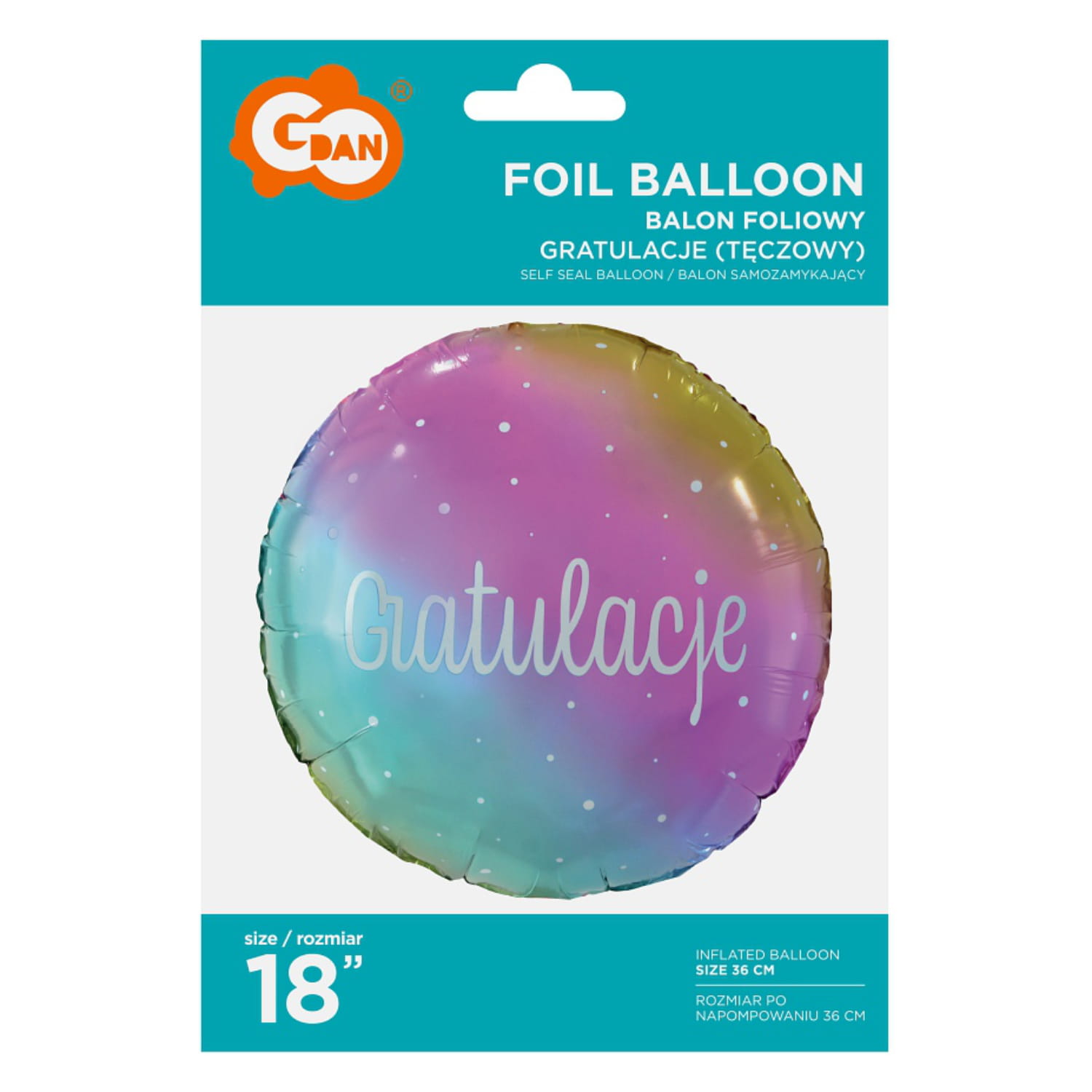 Okrągły, foliowy balon w tęczowym kolorze, z nadrukiem białych kropek i napisem Gratulacje.