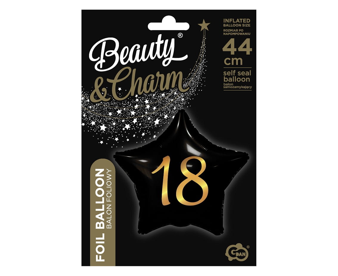 Balon foliowy gwiazda w czarnym kolorze. Przeznaczony na 18 urodziny jest doskonały dla dziewczyny lub chłopaka. Produkt pochodzi z eleganckiej linii Beauty&Charm, cechującej się eleganckim akcentem. Złota metaliczna cyfra 18 świetnie kontrastuje z czarnym tłem. Balon wykonany jest z bardzo wytrzymałej folii i posiada system samo-zamykający. Wszystko to powoduje, że długo będzie się wyśmienicie prezentować. Napełniony helem długo będzie się unosić się w powietrzu. Dzięki dużym rozmiarom 48 cm balon z pewnością przyciągnie uwagę.