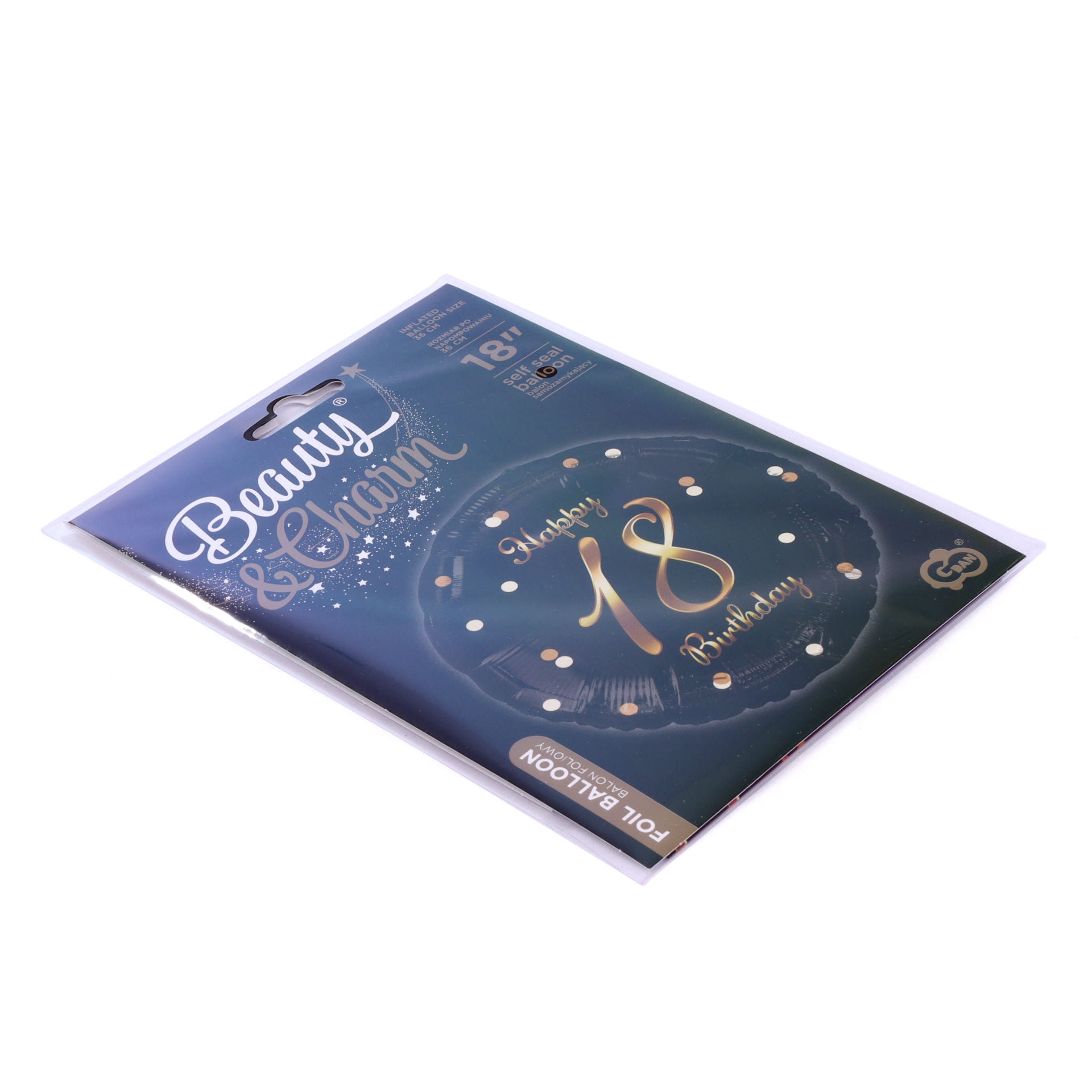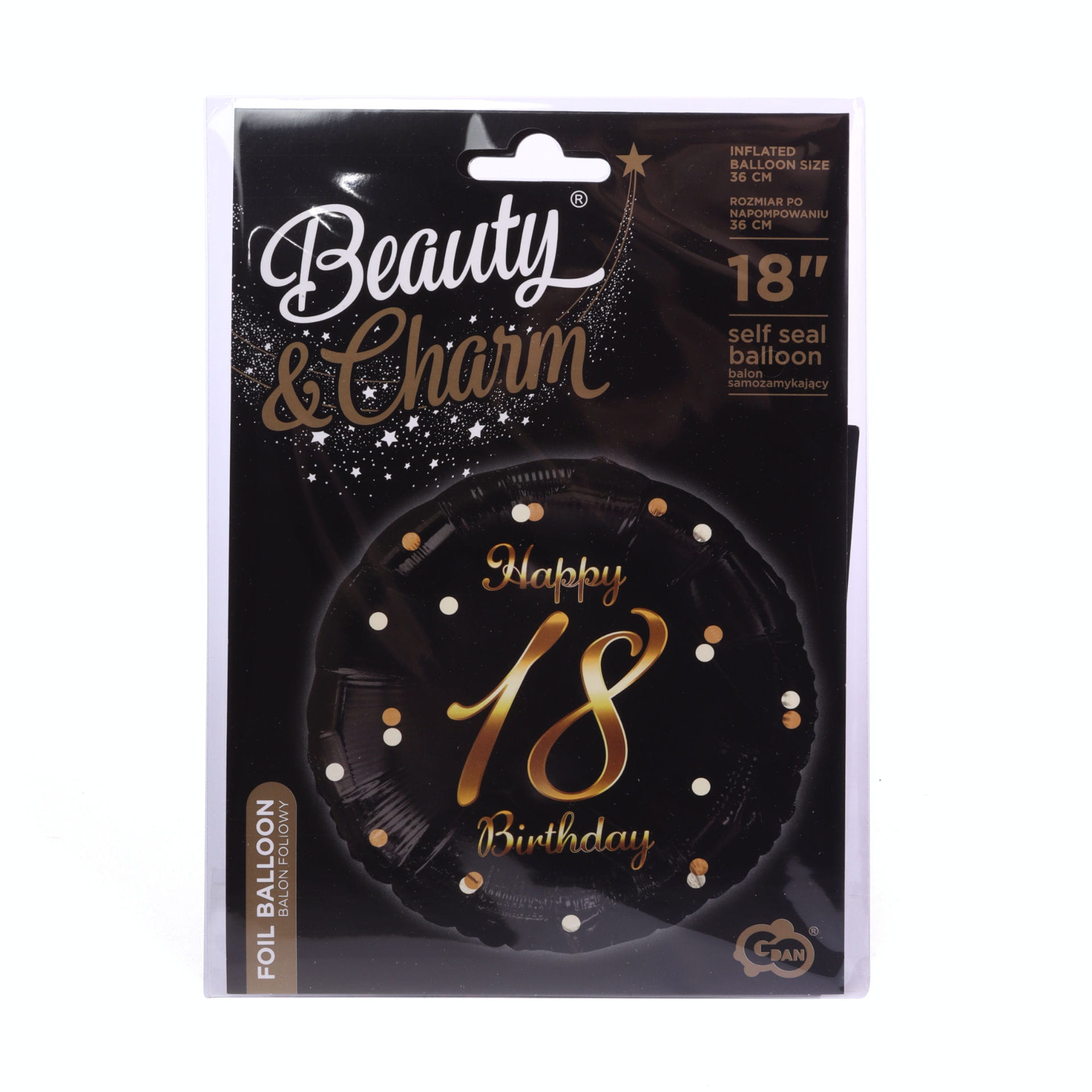 Balon foliowy, okrągły na 18 urodziny w czarnym kolorze ze złoto-różowym nadrukiem „Happy 18 Birthday”. Pochodzi z ekskluzywnej kolekcji Beauty&Charm, co gwarantuje jakość wykonania oraz nietuzinkowy design. Po nadmuchaniu balon ma średnicę 45cm. Można go napełnić helem lub powietrzem. Wyposażony jest w łatwy w użyciu system samozamykający. Ułatwia on wypełnienie balonu jak i zabezpiecza przed uciekaniem z niego powietrza.