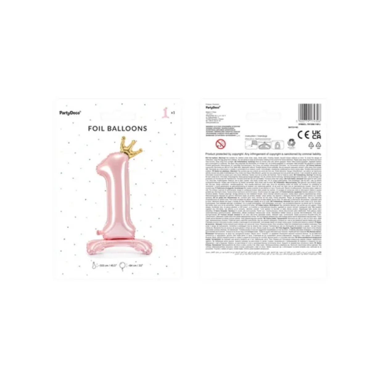 Stojący, foliowy balon w kształcie cyfry 1, na roczek dla dziewczynki. Różowy balon z podstawką umożliwiającą stabilne ustawienie. Dodatkowo cyfra jest ozdobiona złotą koroną. Balon wykonany jest z foli, co powoduje, że jest trwały i wytrzymały. Balon przeznaczony do napełniania powietrzem, idealnie sprawdzi się ustawiony na stole lub jako główny element dekoracji na podłodze. Po napełnieniu balon ma wysokość ok. 84cm.
