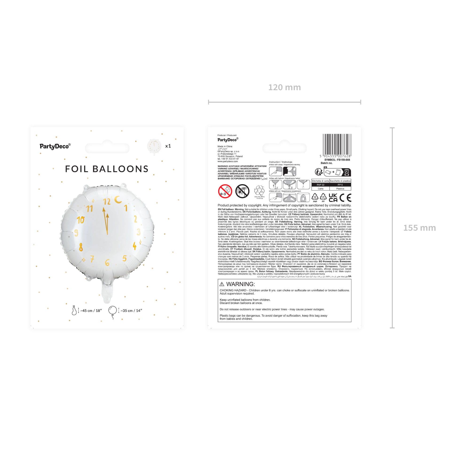Okrągły, biały balon foliowy z nadrukiem złotej tarczy zegara. Idealnie nadaje się jako dekoracja na imprezę sylwestrową.