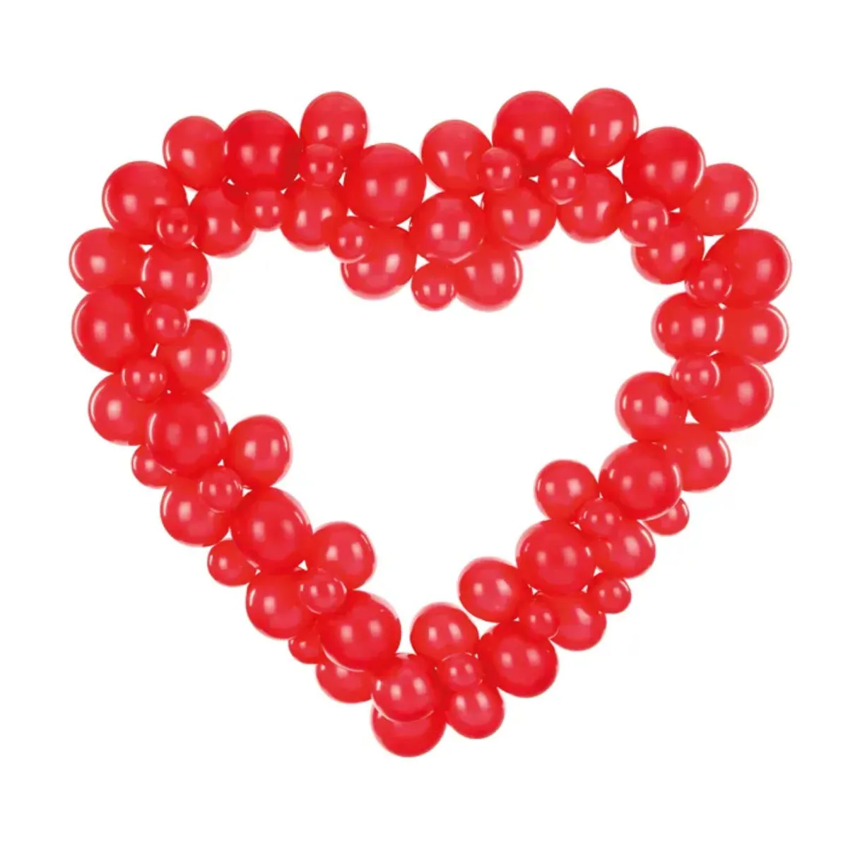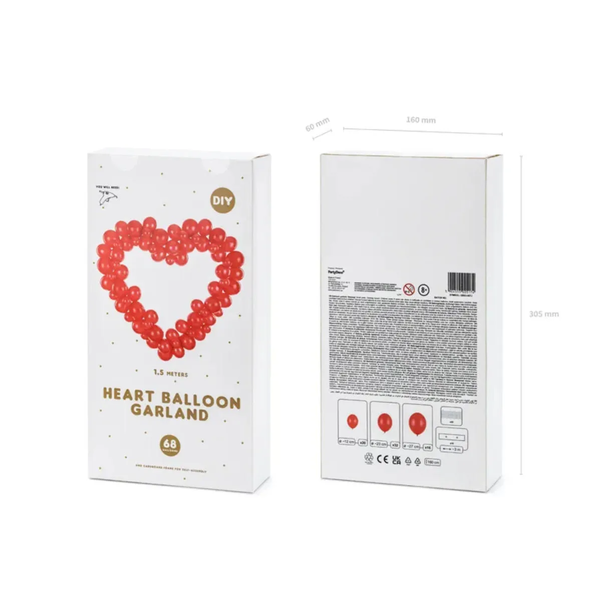 Girlanda balonowa w kształcie serca w kolorze czerwonym. Serce składa się z 68 balonów do samodzielnego napełnienia. W zestawie znajduje się także 16 kartonowych elementów oraz 20 naklejek dwustronnych służących do stworzenia stelaża. Gotowa, złożona girlanda idealnie sprawdzi się jako dekoracja ściany na dowolnej uroczystości. Balony posiadają odpowiedniej długości końcówkę, ułatwiająca wiązanie. Produkt wykonany z naturalnego lateksu, w pełni biodegradowalny. Balony przeznaczone do napełniania powietrzem.