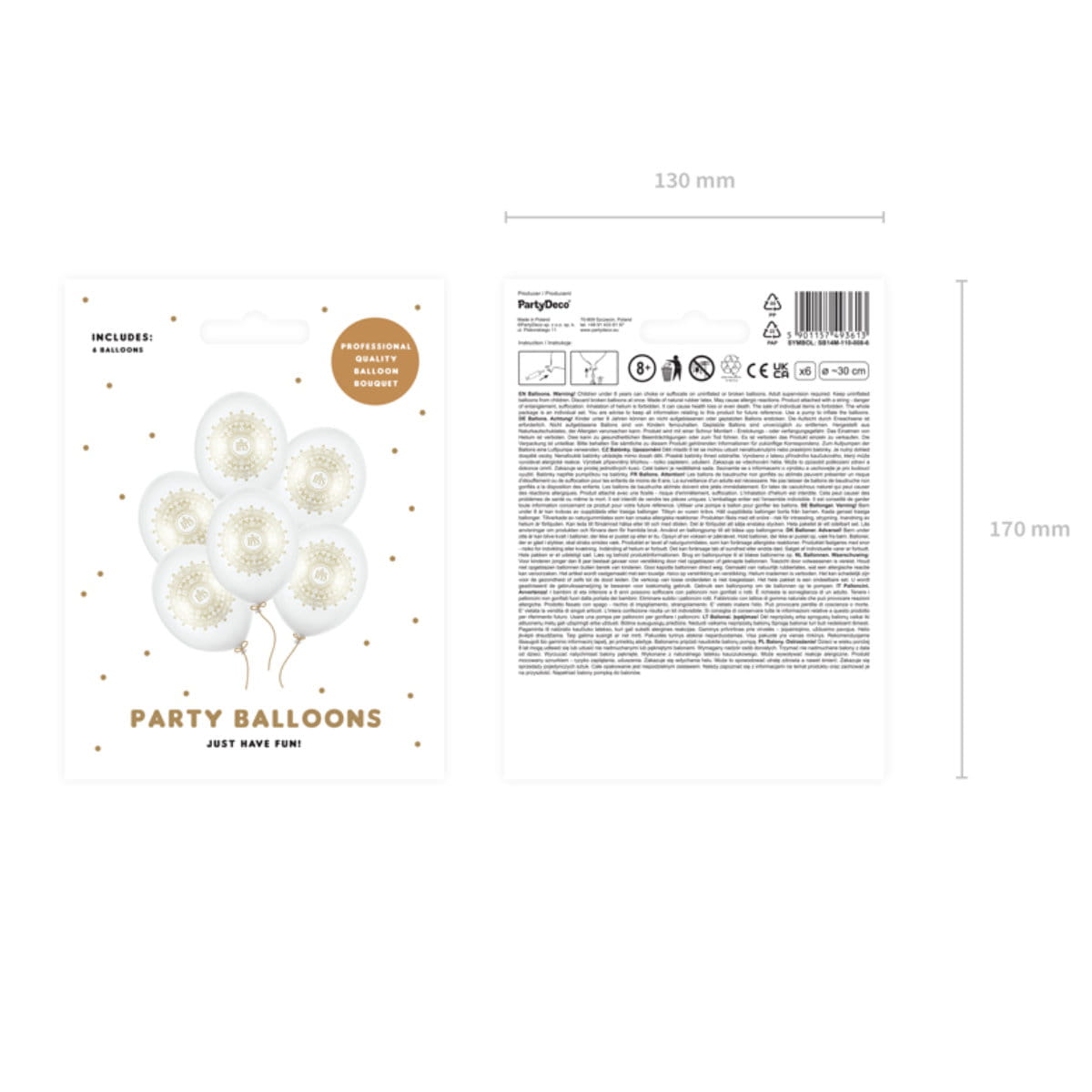Balony na Komunię, w białym kolorze ze złotym nadrukiem. W środku wzoru mandali znajduje się napis IHS. Cały wzór posiada elegancki, metaliczny połysk. Dzięki uniwersalnej kolorystyce balon nadaje się na przyjęcie komunijne chłopca lub dziewczynki. Po napełnieniu balon osiąga rozmiar ok. 30cm. W opakowaniu znajduje się 6 jednakowych balonów.