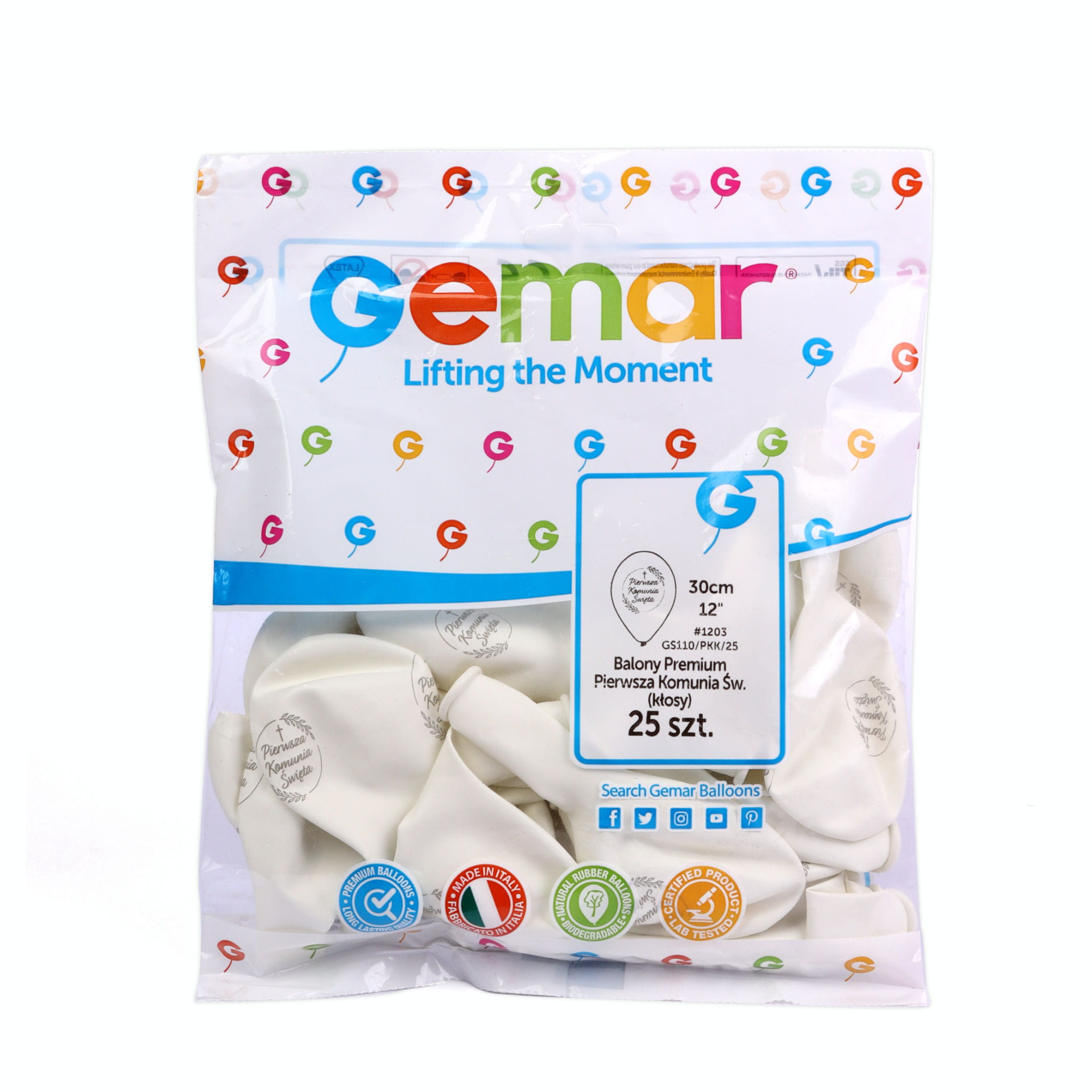 Balony na komunię ze srebrnym nadrukiem „Pierwsza Komunia Święta”. Po nadmuchaniu mają wielkość 30cm. Można je napełnić helem lub powietrzem. Produkt wysokiej jakości, znanego włoskiego producenta - firmy Gemar. Opakowanie zawiera 25 balonów.