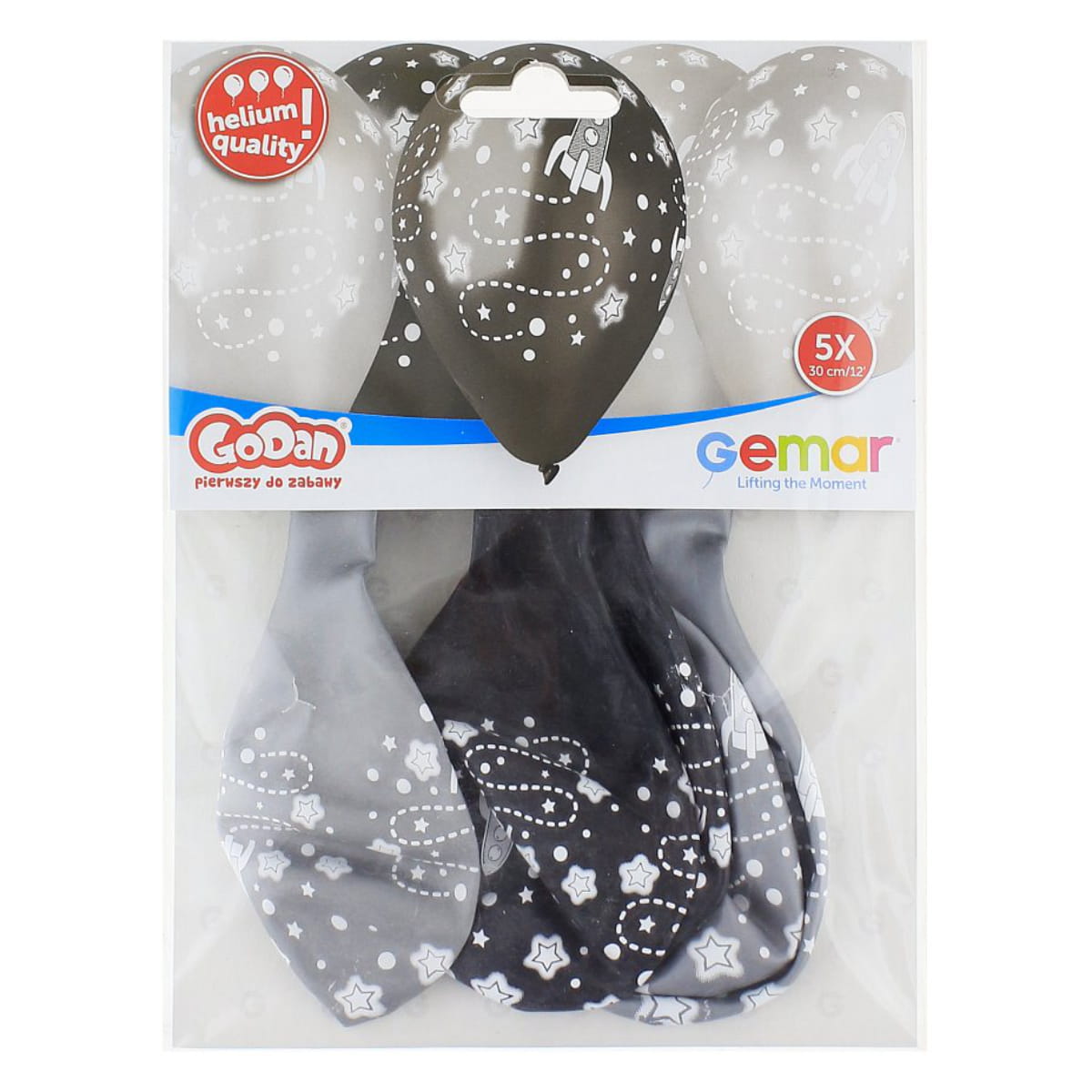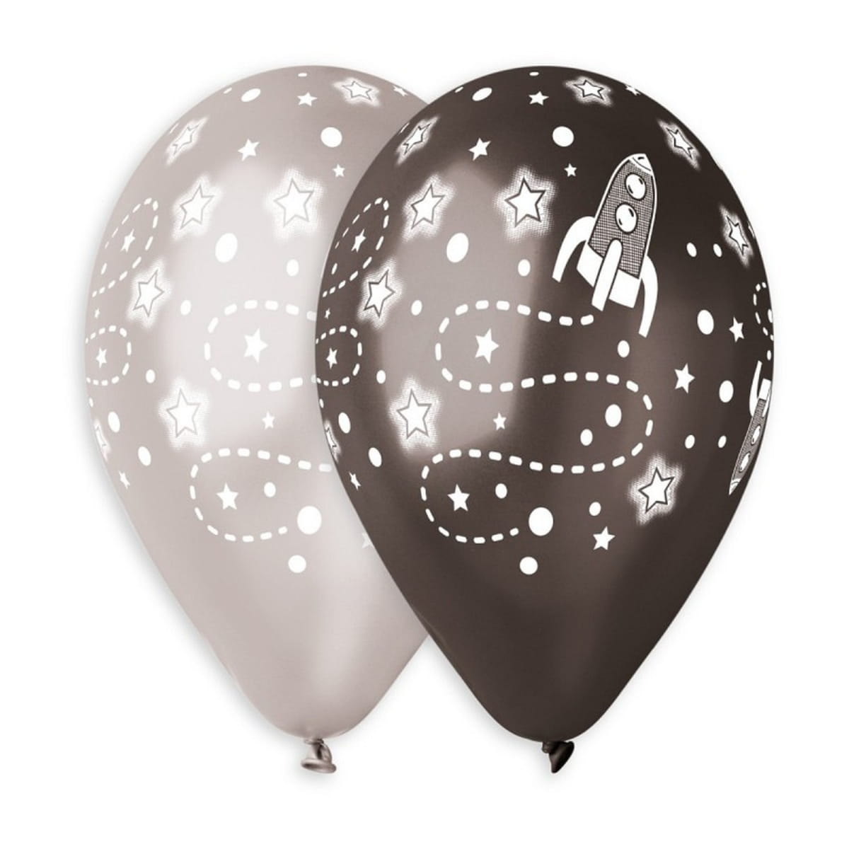 Balony lateksowe Premium Kosmos, do napełniania powietrzem lub helem. W opakowaniu znajdują się metalizowane balony w kolorze czarnym i srebrnym, z nadrukiem rakiety kosmicznej i gwiazdek. Idealnie nadają się na urodziny dorosłych oraz na każdą imprezę dziecięcą. Świetnie sprawdza się także jako dekoracja w pokoju dziecka. Po napełnieniu balony mierzą około 33cm. W komplecie znajduje się 5 sztuk balonów o wysokiej jakości Helium Quality. Balony posiadają odpowiedniej długości końcówkę, ułatwiająca wiązanie. Produkt wykonany z naturalnego lateksu i jest w pełni biodegradowalny.