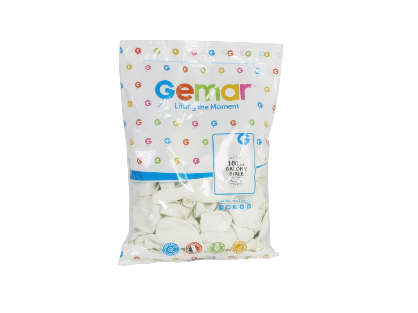 Balony lateksowe w białym kolorze. Produkt jest ekologiczny, wykonany z naturalnych surowców a więc i w pełni biodegradowalny. Balony można nadmuchać helem lub powietrzem. Po wypełnieniu gazem mają wielkość 30 cm. Konstrukcja końcówki ułatwia zawiązywanie balonu i zastosowanie w konstrukcjach z użyciem taśm do girland balonowych lub prezenterów.
