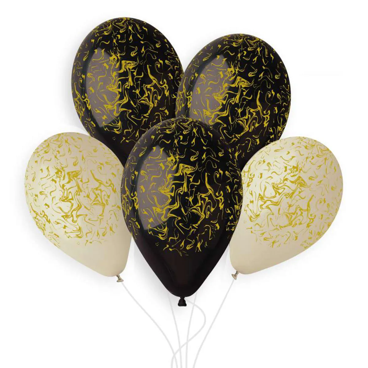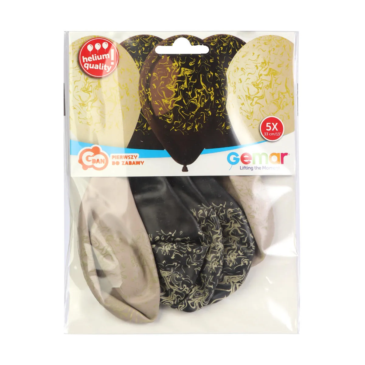 Balony lateksowe Premium Marble, do napełniania powietrzem lub helem. W opakowaniu znajdują się matowe balony w kolorze czarnym i beżowym, ze złotym nadrukiem wzoru imitującego marmur. Idealnie nadają się na każdą uroczystość dla dzieci i dorosłych. Po napełnieniu balony mierzą około 33cm. W komplecie znajduje się 5 sztuk balonów o wysokiej jakości Helium Quality. Balony posiadają odpowiedniej długości końcówkę, ułatwiająca wiązanie. Produkt wykonany z naturalnego lateksu i jest w pełni biodegradowalny.