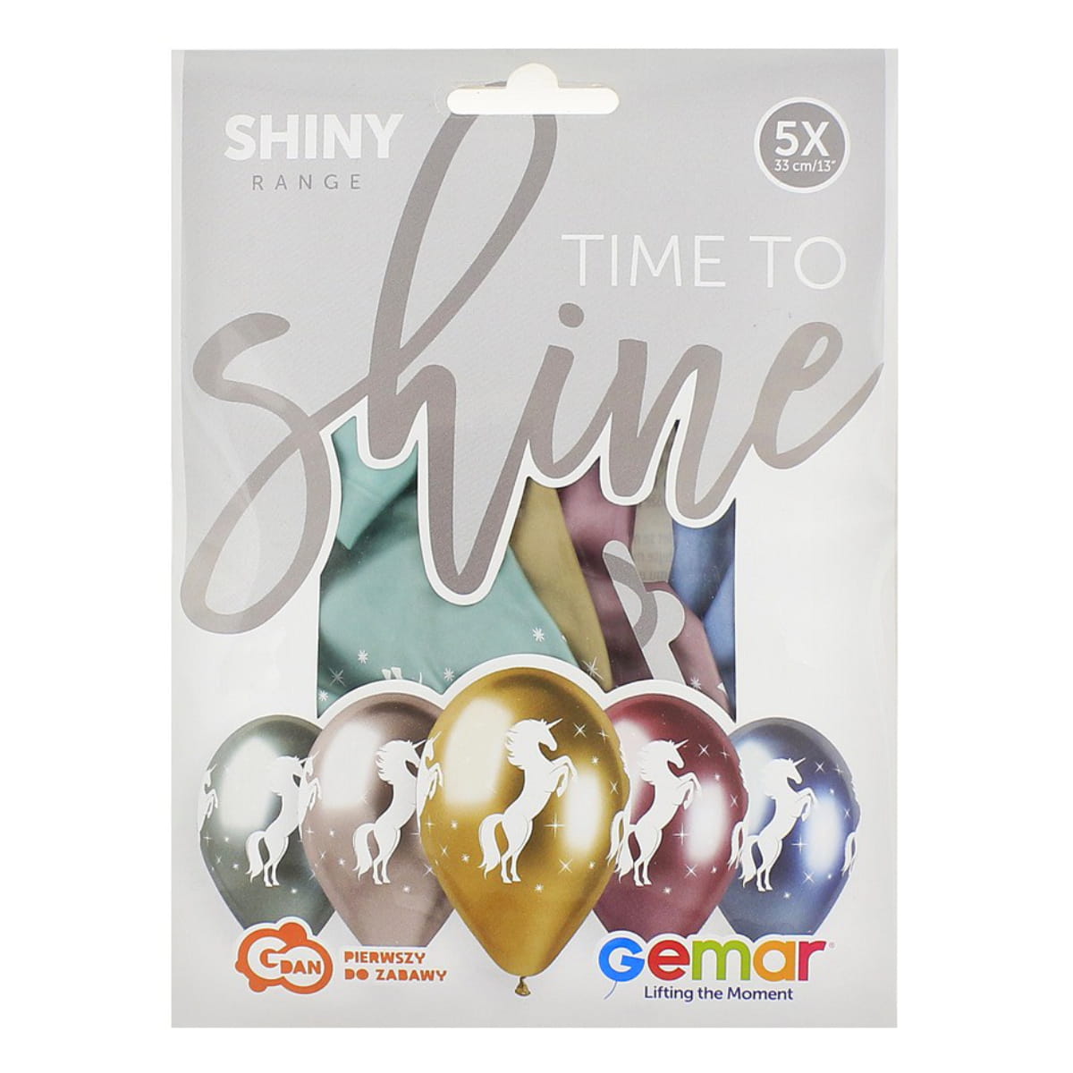 Błyszczące balony lateksowe z serii Shiny, Time to Shine. Opakowanie zawiera balony w różnych kolorach, z białym nadrukiem w postaci jednorożca i metalicznym wykończeniem. Balony Wykonane z wysokiej jakości, miękkiej gumy, która charakteryzuje się sporą rozciągliwością. Po napełnieniu balony osiągają rozmiar około 33cm, ale unoszą się po napełnieniu helem. W komplecie znajduje się 5 sztuk, które posiadają odpowiedniej długości końcówkę, ułatwiająca wiązanie.