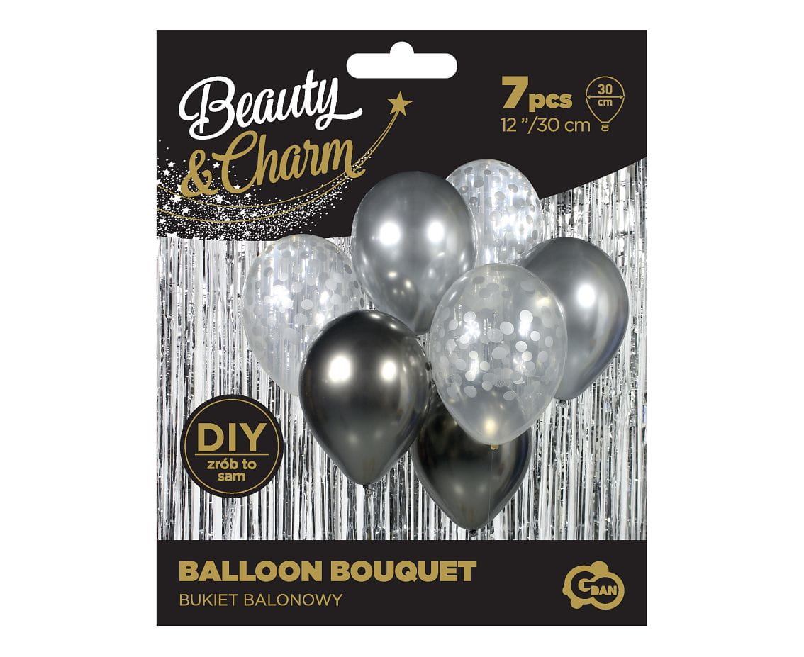 Zestaw odpowiednio dobranych kolorystycznie balonów, tworzą wyjątkowy dekoracyjny balonowy bukiet. Balony są wysokiej jakości, napełnione helem lub powietrzem długa będą się unosić ciesząc oko. Kompozycja zawiera balony platynowe, transparentne i metaliczne w odcieniach szarości oraz srebra. Taka mieszanka kolorystyczna sprawia, że bukiet doskonale sprawdzi się na wszelkich męskich imprezach jak urodziny, imieniny czy wieczór kawalerski.