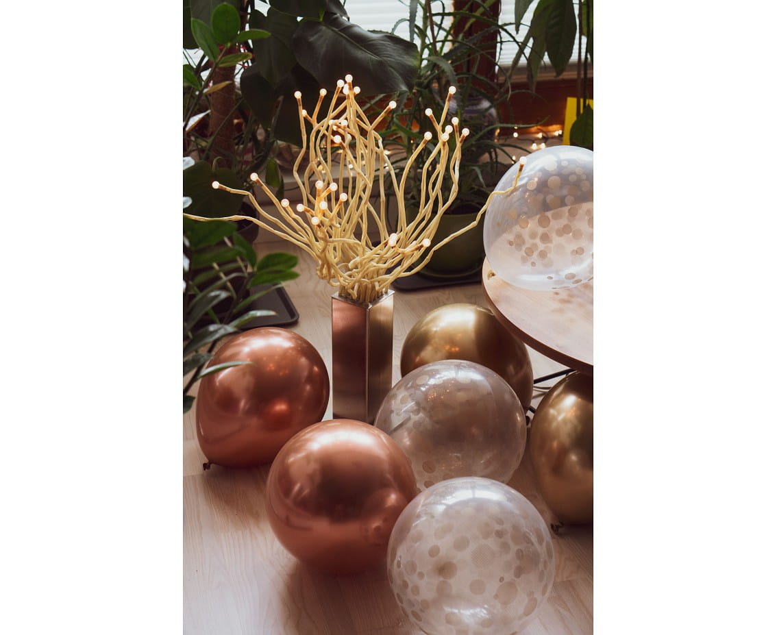 Wyjątkowy zestaw balonów lateksowych w kolorze złota i miedzi z wyjątkowej kolekcji Beauty&Charm. Jest to produkt wysokiej jakości, który długo będzie cieszyć oko. Bukiet obejmuje 7 sztuk balonów o wielkości 30 cm, napełnione helem unoszą się bardzo długo, nie ucieka z nich powietrze. Dłuższa końcówka balonów ułatwia ich wiązanie.