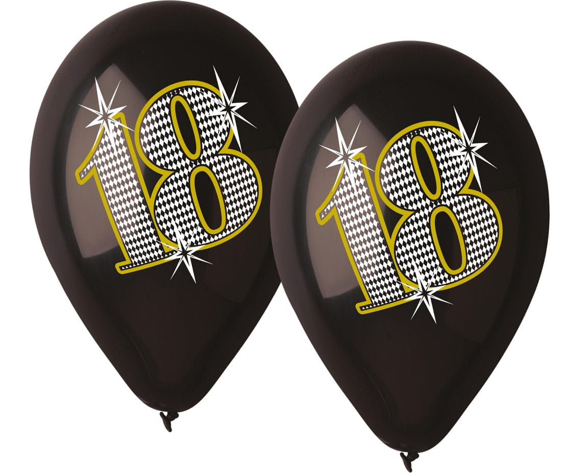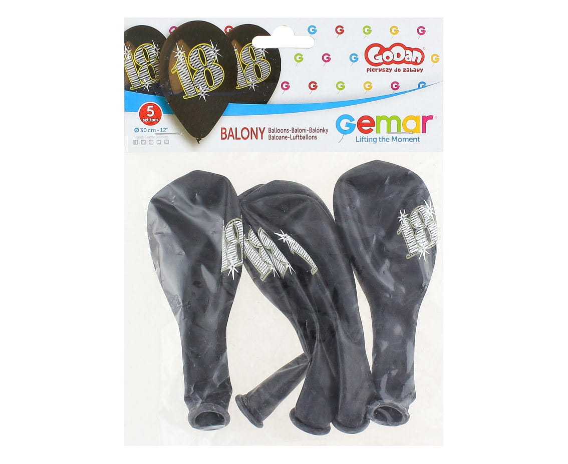 Balony na 18 urodziny ze złotym nadrukiem. Bazowy kolor to czarny, dzięki czemu balony są doskonałe na eleganckie przyjęcia dla rodziny. Bedą pasować do dodatków w każdym kolorze. Po nadmuchaniu balon mierzy około 30 cm. Opakowanie zawiera 5 sztuk biodegradowalnych balonów lateksowych.