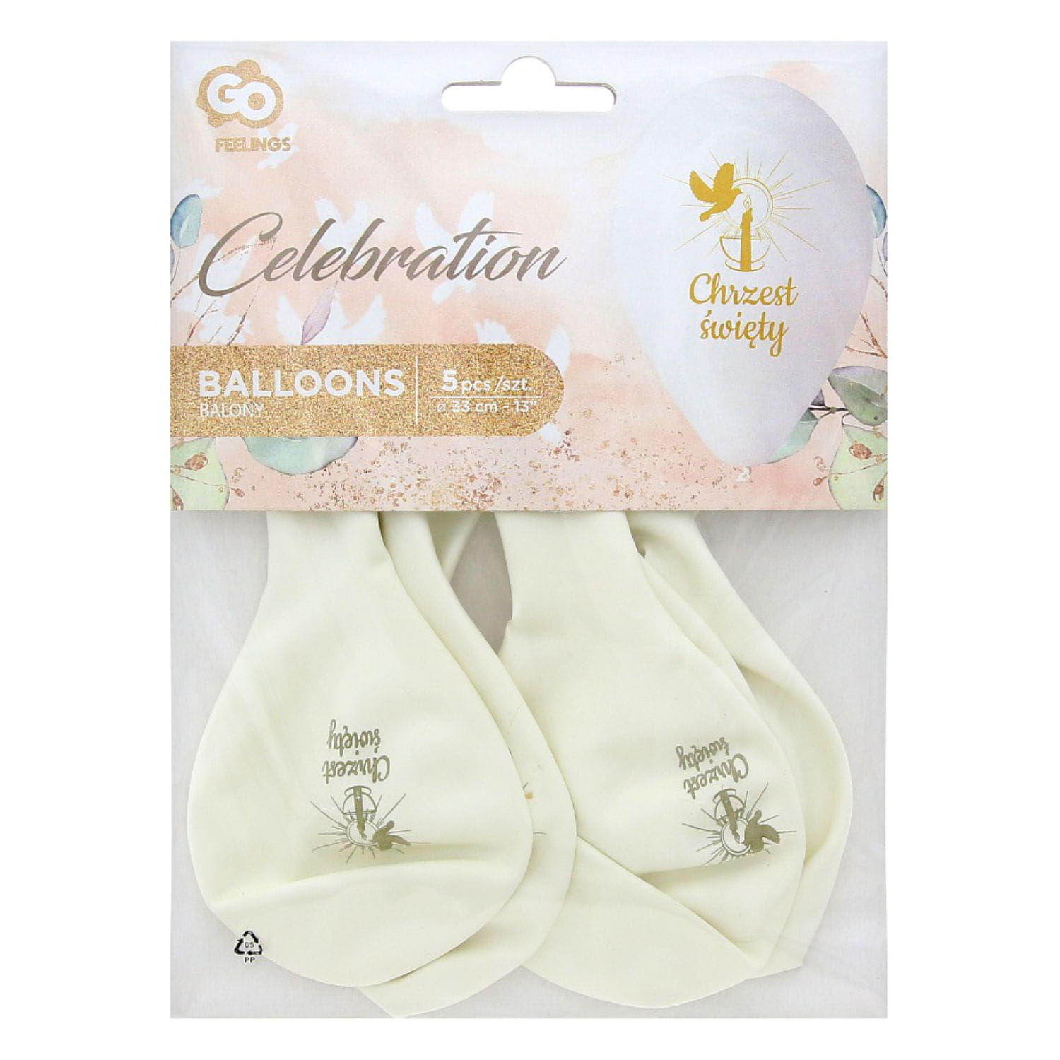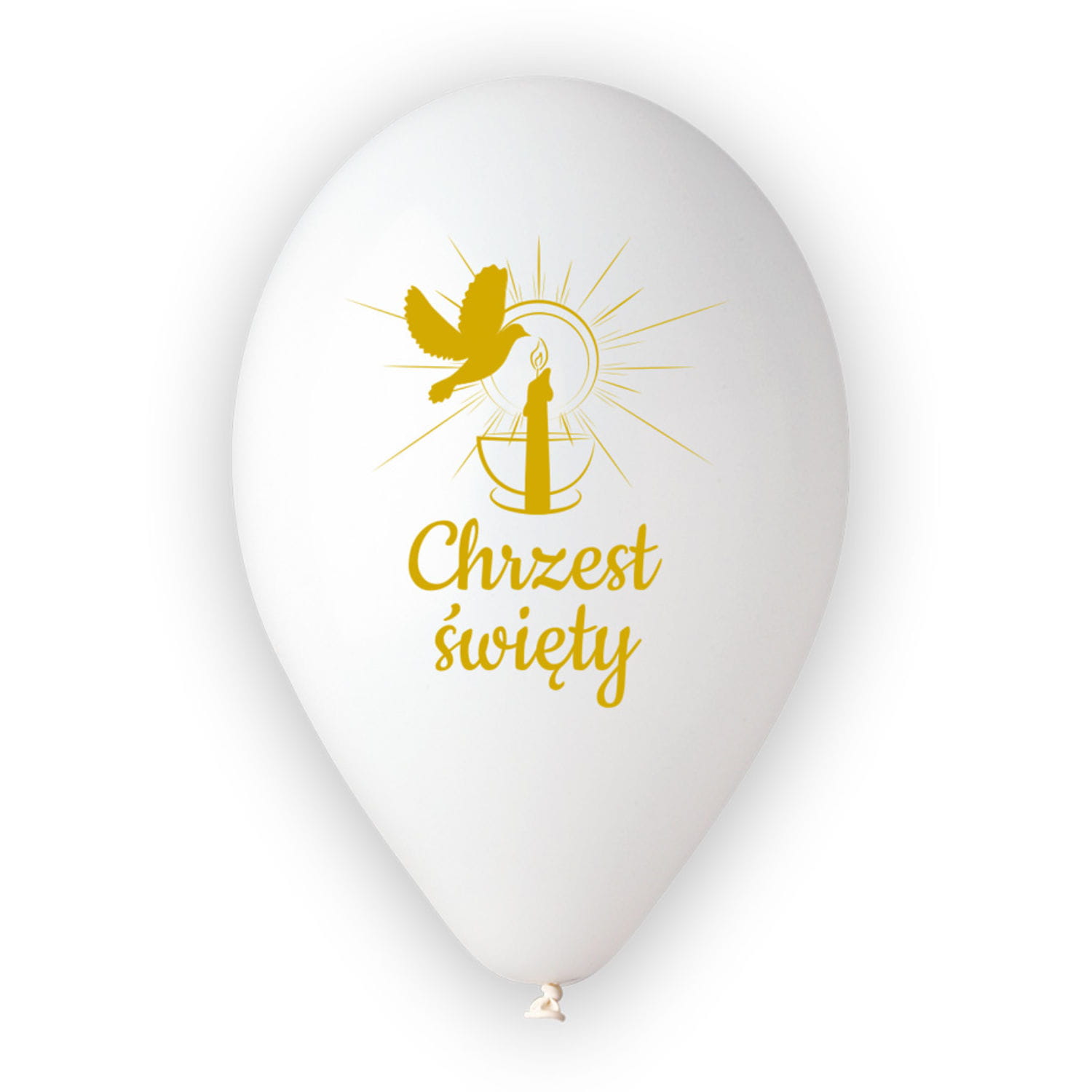 Lateksowe balony Premium na Chrzest, do napełniania powietrzem lub helem. W komplecie znajdują się balony w kolorze białym, z nadrukiem świecy, gołębia i napisem Chrzest Święty. Balony posiadają odpowiedniej długości końcówkę, ułatwiająca napełnianie i wiązanie. Po napełnieniu balony mierzą około 33cm. Produkt wykonany z naturalnego lateksu, w pełni biodegradowalny.