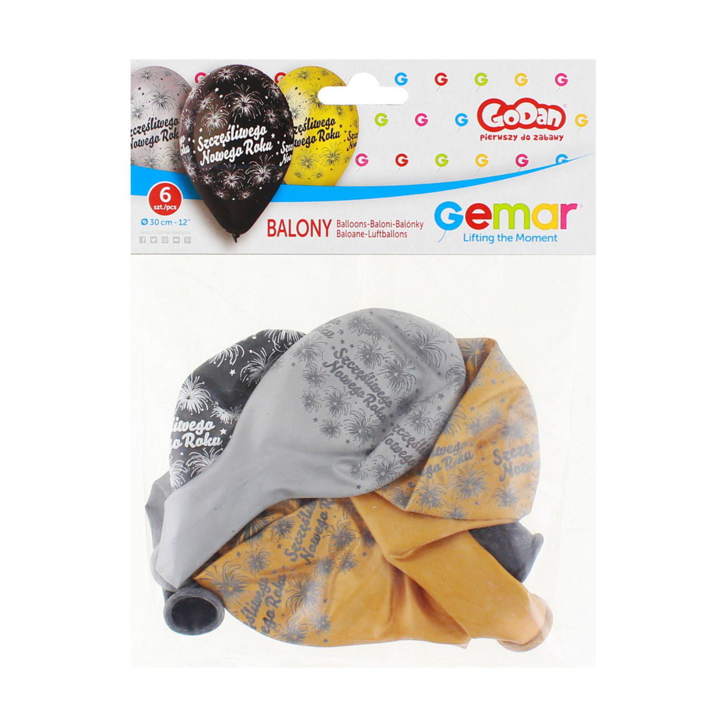 Lateksowe balony premium firmy Gemar, z napisem Szczęśliwego Nowego Roku. Komplet składa się z 6 metalicznych balonów w trzech kolorach : srebrnym, złotym i czarnym. Można je wypełnić powietrzem lub helem. Po nadmuchaniu mają wysokość około 30 cm.