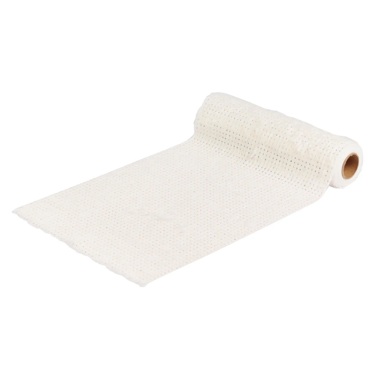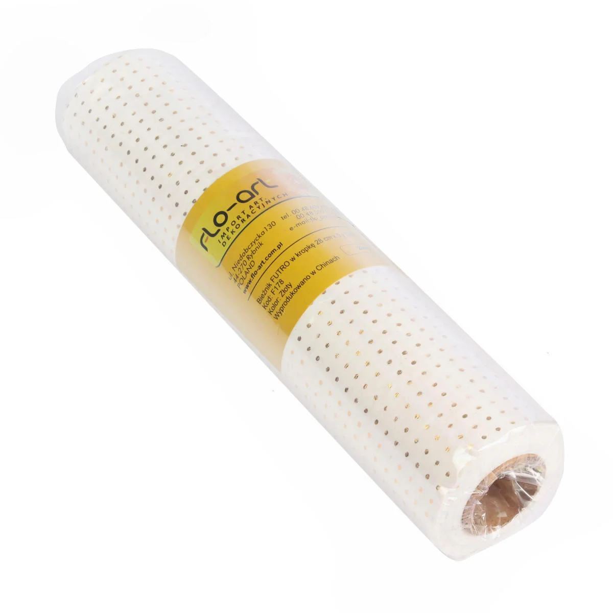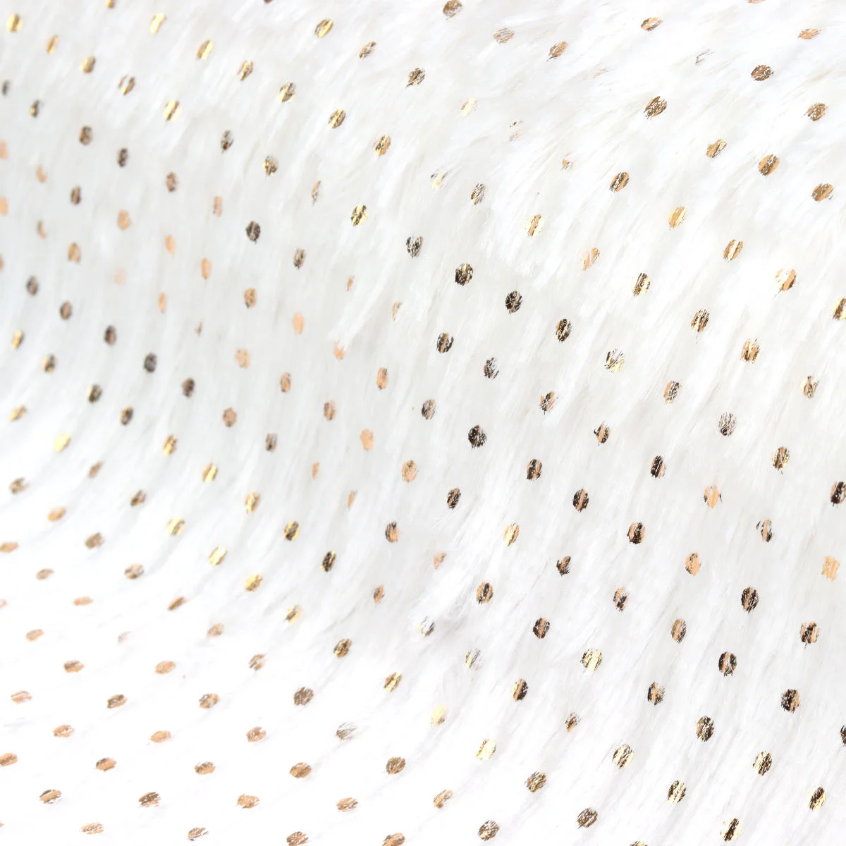 Dekoracyjna tkanina futerko, bieżnik wykonany z puchatej, bardzo przyjemnej w dotyku tkaniny poliestrowej w kolorze białym, dodatkowo ozdobionej złotymi kropeczkami. Bieżnik idealnie nadaje się na ozdobę stołu i doskonale komponować się będzie ze złotymi i czerwonymi dodatkami. Sprawdzi się także przy tworzeniu wianków, stroików, kartek świątecznych lub przy pakowaniu prezentów.