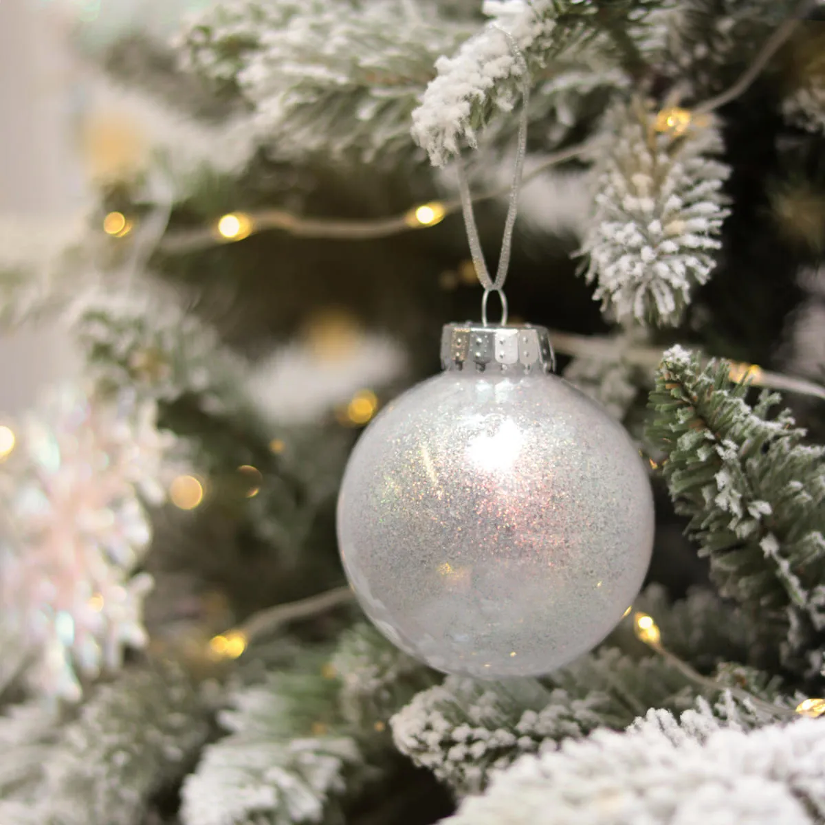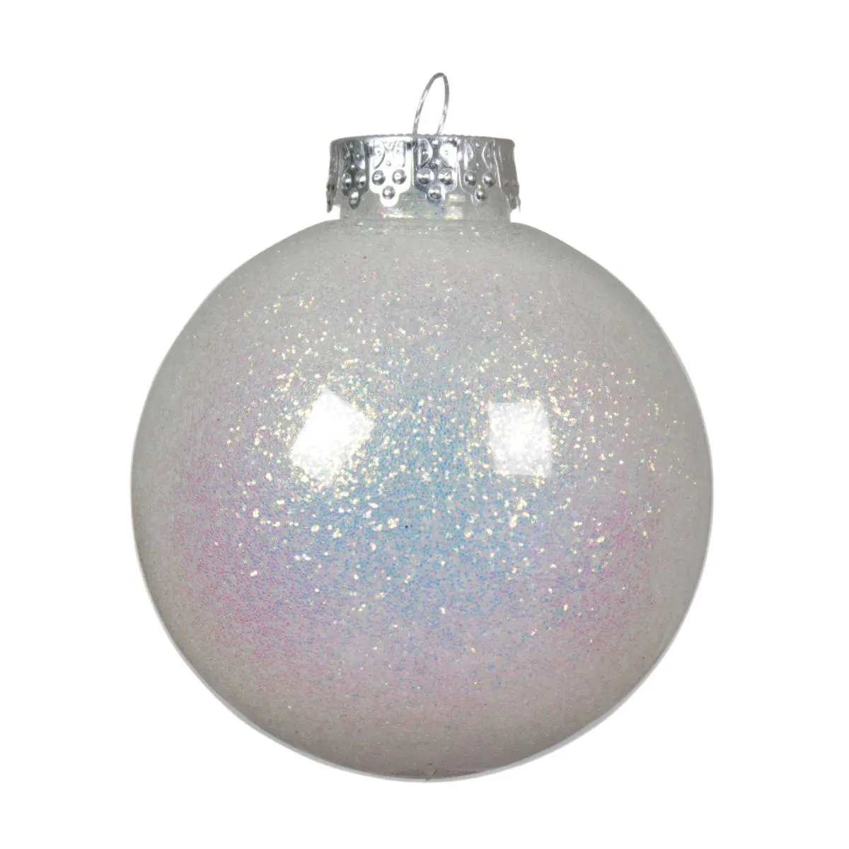 Dekoracyjna bombka choinkowa o średnicy 8cm. Półprzeźroczysta bombka z opalizującą, perłową poświatą. Wykonana z tworzywa sztucznego i ozdobiona od środka dużą ilością brokatu. Kula idealnie sprawdzi się zawieszona w oknie, na choince, girlandzie świątecznej lub na stojaku. Sprawdzi się również jako drobny, mikołajkowy upominek lub dodatek do świątecznego prezentu.