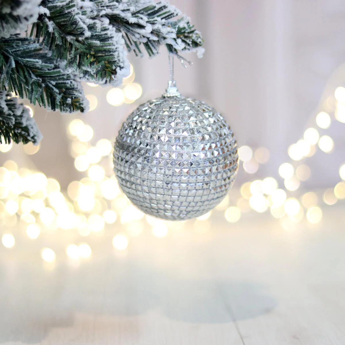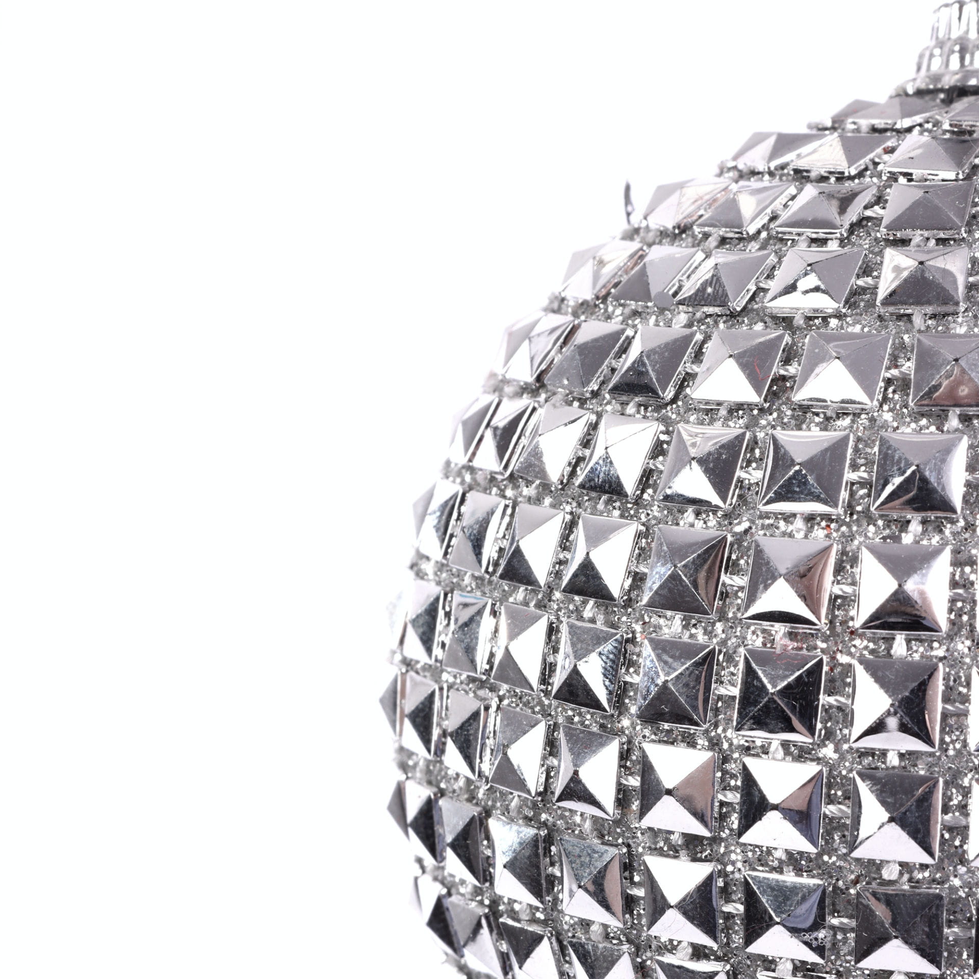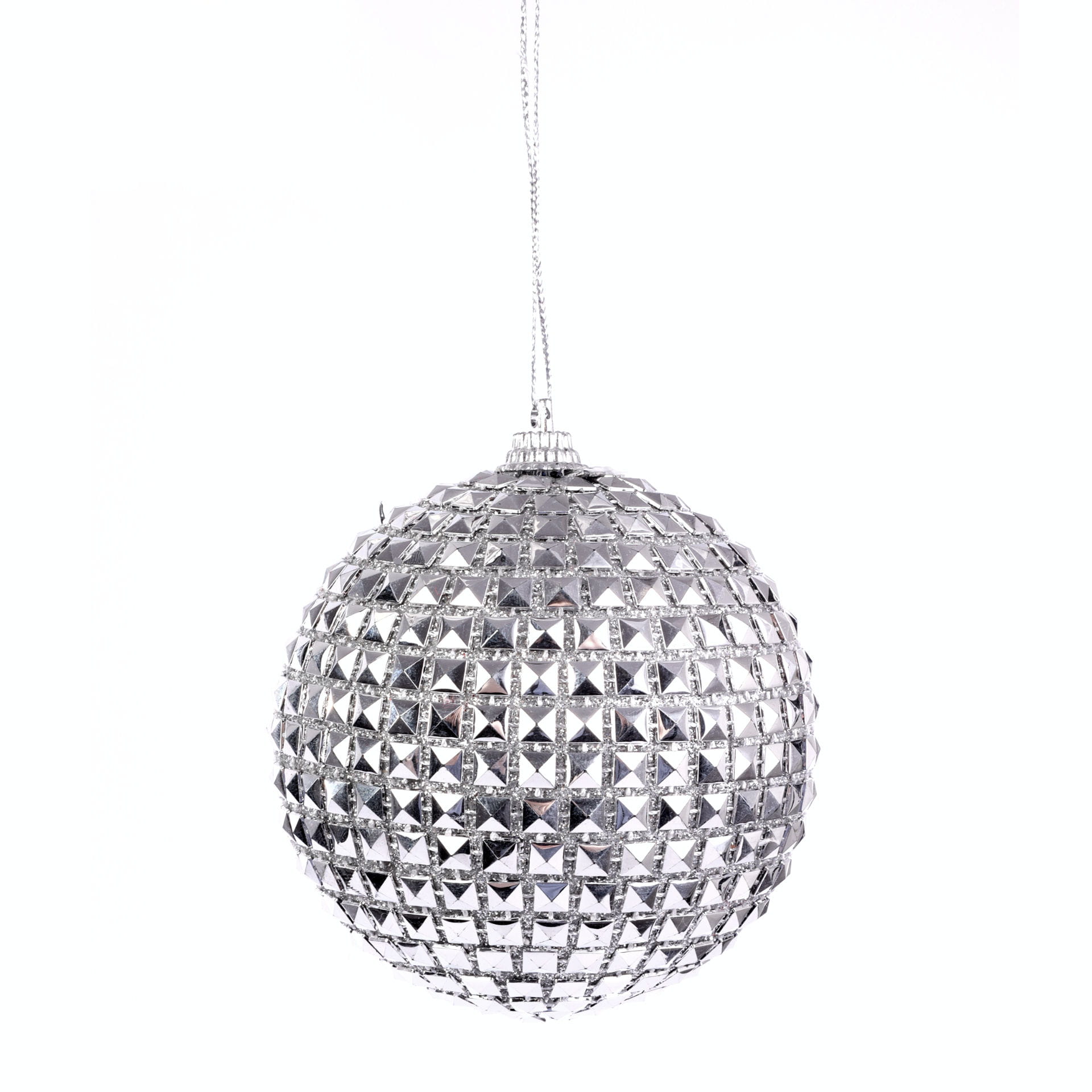 Bombka dekoracyjna w kształcie kuli o średnicy 8cm. Wykonana jest z poliestru i polipianki, w całości pokryta została małymi, srebrnymi koralikami tworzącymi efekt mozaiki. Każda bombka dekoracyjna zawiera ozdobny, srebrny sznureczek do jej zawieszenia.