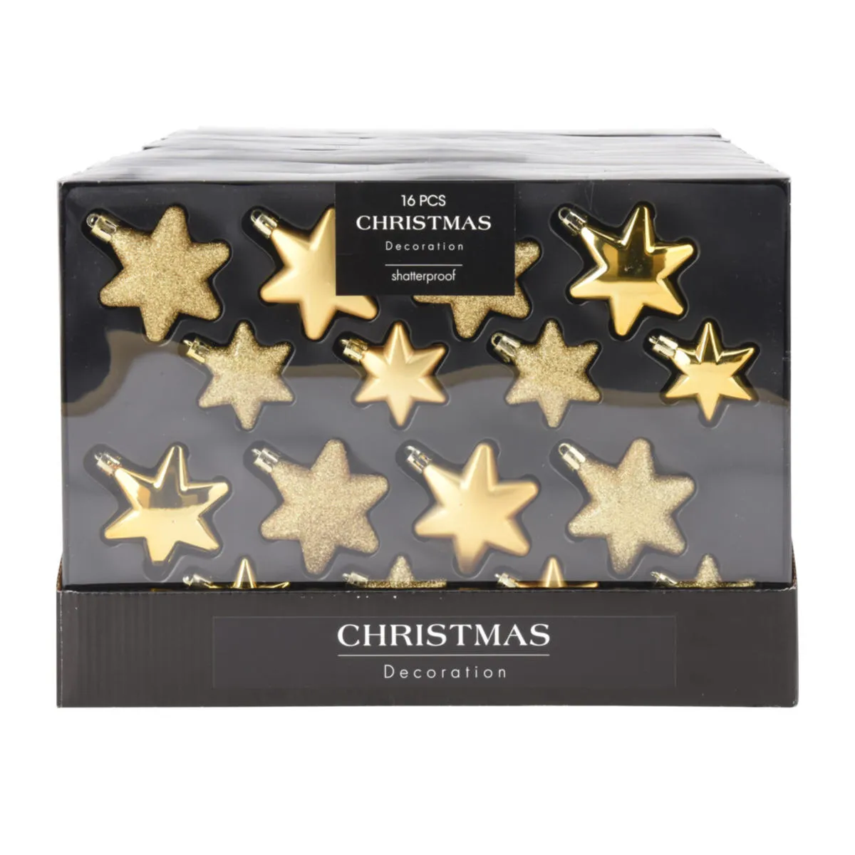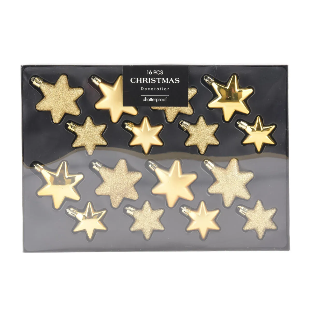 Komplet 16 bombek w kształcie gwiazdek w dwóch rozmiarach. Nietłukące gwiazdki wykonane z wysokiej jakości tworzywa sztucznego, w komplecie ze złotymi sznureczkami służącymi do zawieszania. W zestawie znajdują się trzy warianty gwiazdek : 4 sztuki z matowym wykończeniem, 4 błyszczące oraz 8 bombek obficie obsypanych brokatem. Całość zapakowana jest w pudełko z celofanowym wieczkiem.