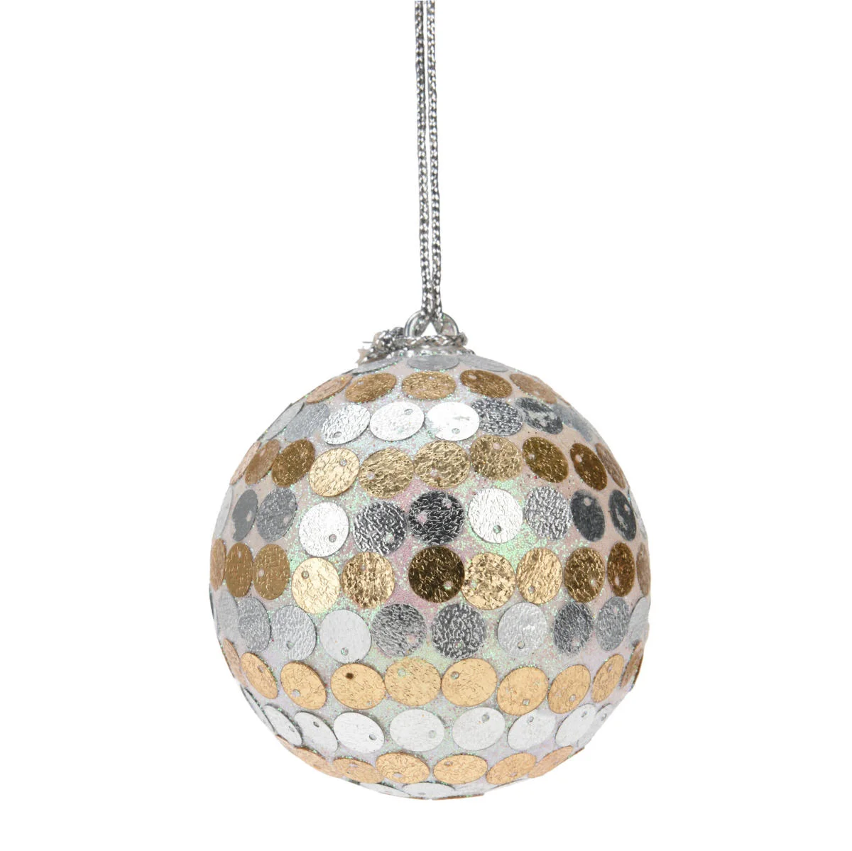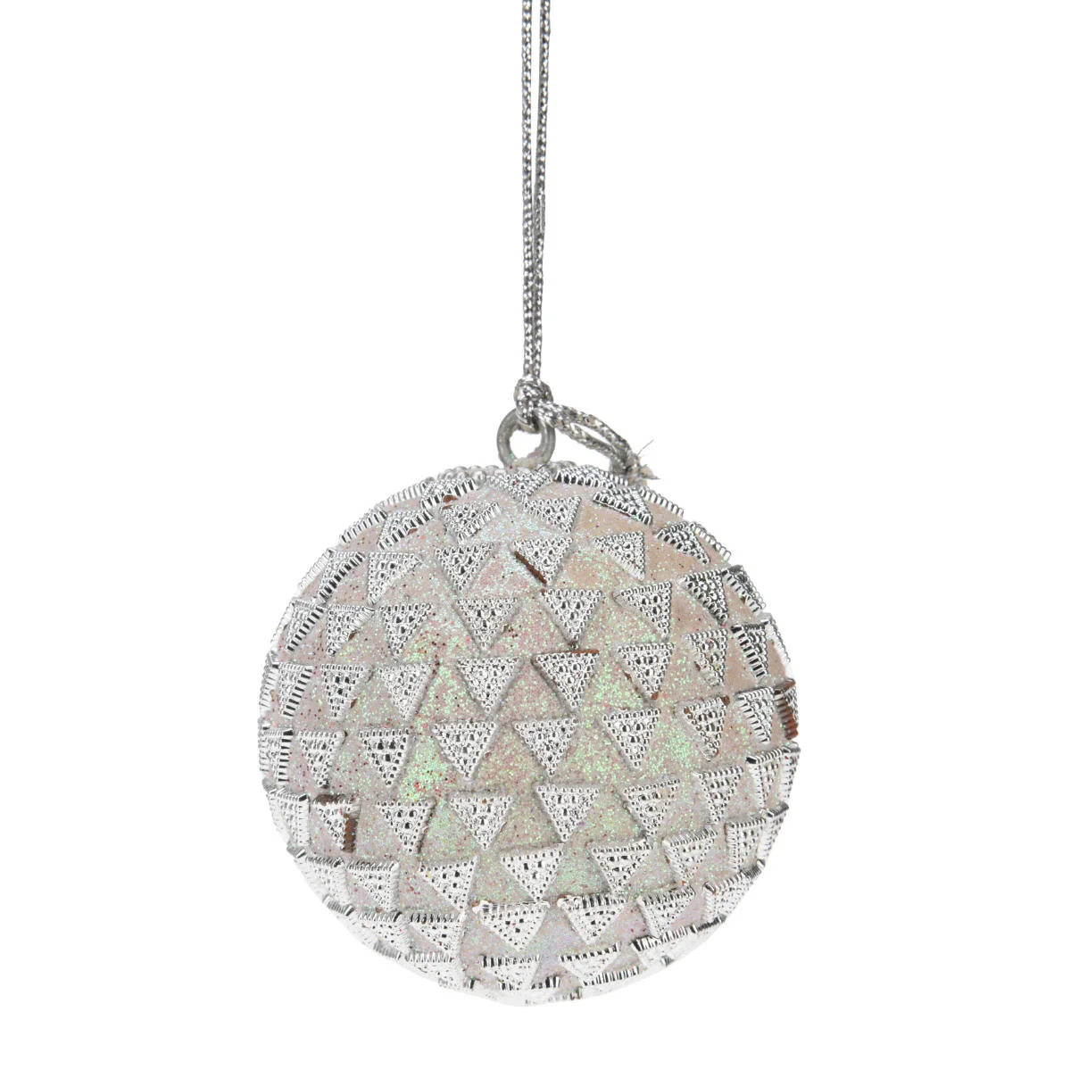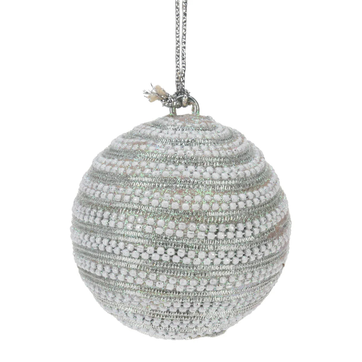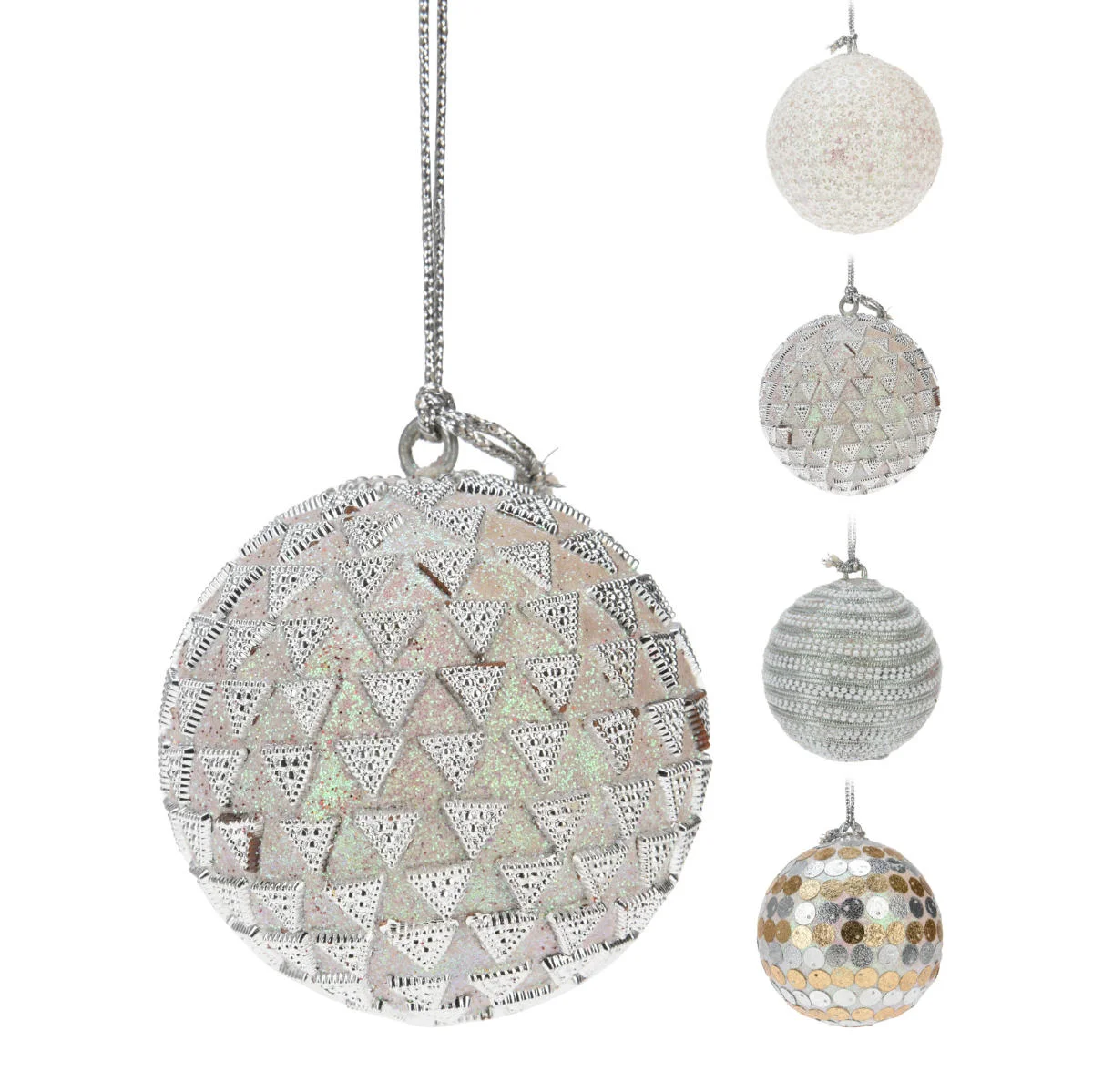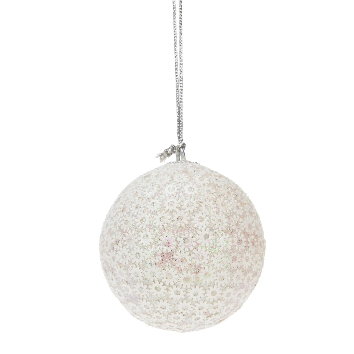 Zestaw 12 dekoracyjnych bombek choinkowych w klasycznym kształcie. Nietłukące bombki o średnicy 70mm, wykonane są bardzo starannie z wysokiej jakości tworzywa sztucznego. Kule w czterech różnorodnych wzorach, ozdobione brokatem oraz koralikami i cekinami. Bombki utrzymane są w biało-srebrnych barwach z opalizującą poświatą. Każda bombka posiada haczyk i dekoracyjny srebrny sznureczek umożliwiający zawieszanie.