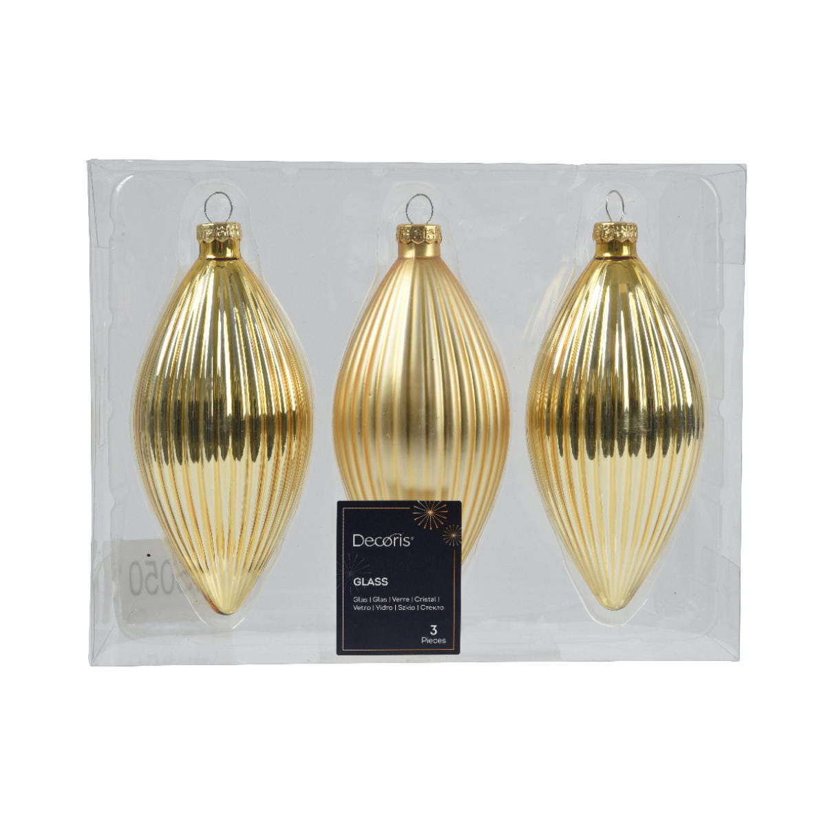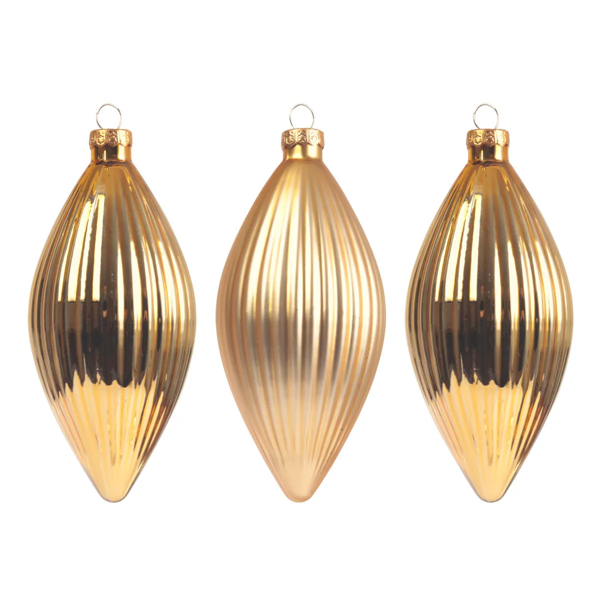 Szklane, karbowane bombki choinkowe w kształcie oliwek o długości 13cm. Wykonane z wysokiej jakości szkła w złotym kolorze. W komplecie znajdują się 2 bombki z błyszczącym wykończeniem i 1 bombka matowa. Bombki wyposażone są w ozdobny haczyk w kolorze pasującym do całości. Bombki stylizowane są na stare i będą piękną, klasyczną dekoracją choinki lub girlandy. Podana cena dotyczy kompletu 3 sztuk bombek.