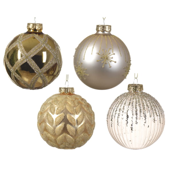 Bombki choinkowe w odcieniach koloru złotego. Szklane bombki z brokatem, o średnicy 8cm. Zestaw obejmuje 4 wzory, karbowane, z wypukłym wzorem oraz tradycyjne gładkie z delikatną aplikacją. Elementami dekoracyjnymi są drobne kryształki, cekiny i brokat. Bombki sprawiają wrażenie lekkich i delikatnych.