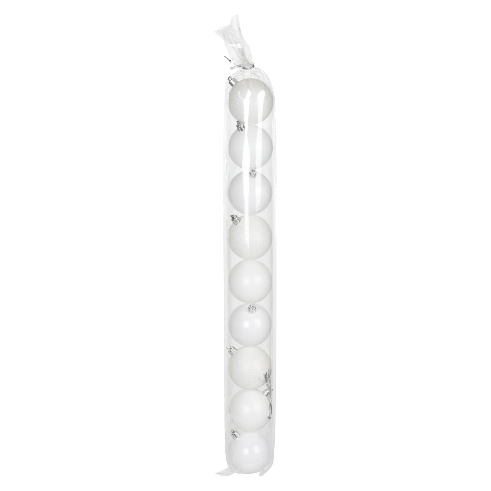 Zestaw 9 bombek o średnicy 60mm, w kolorze białym. Nietłukące bombki wykonane z tworzywa sztucznego w komplecie ze złotymi sznureczkami służącymi do zawieszania. W zestawie znajdują się trzy warianty bombek : 3 sztuki z matowym wykończeniem, 3 lekko błyszczące oraz 3 bombki obficie obsypane brokatem. Całość zapakowana jest w folię imitująca tubę.