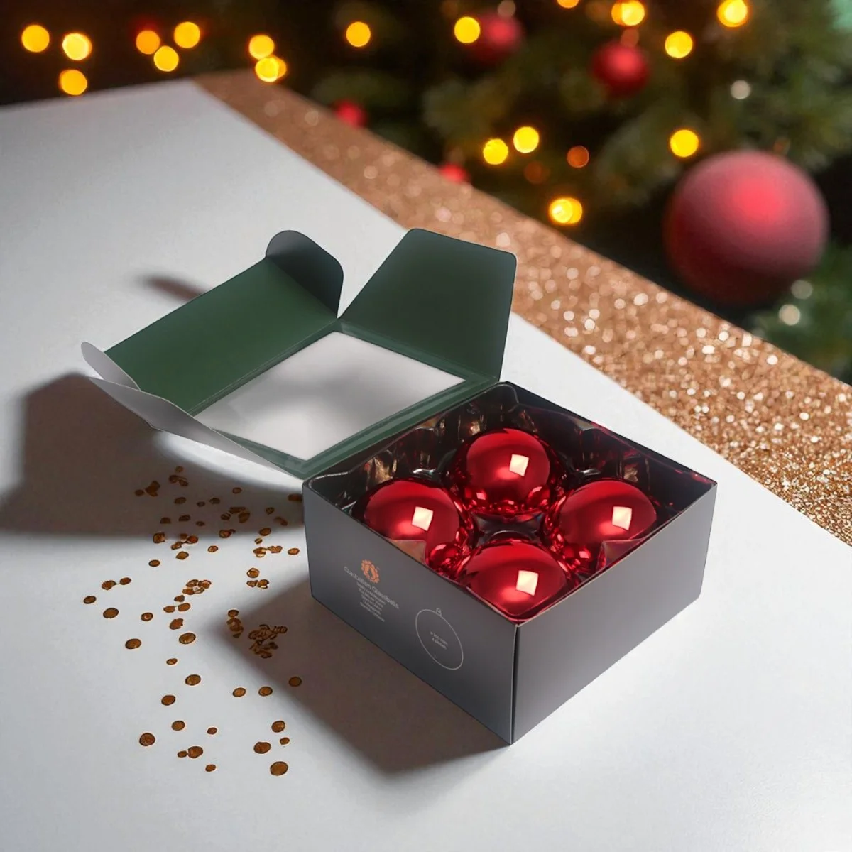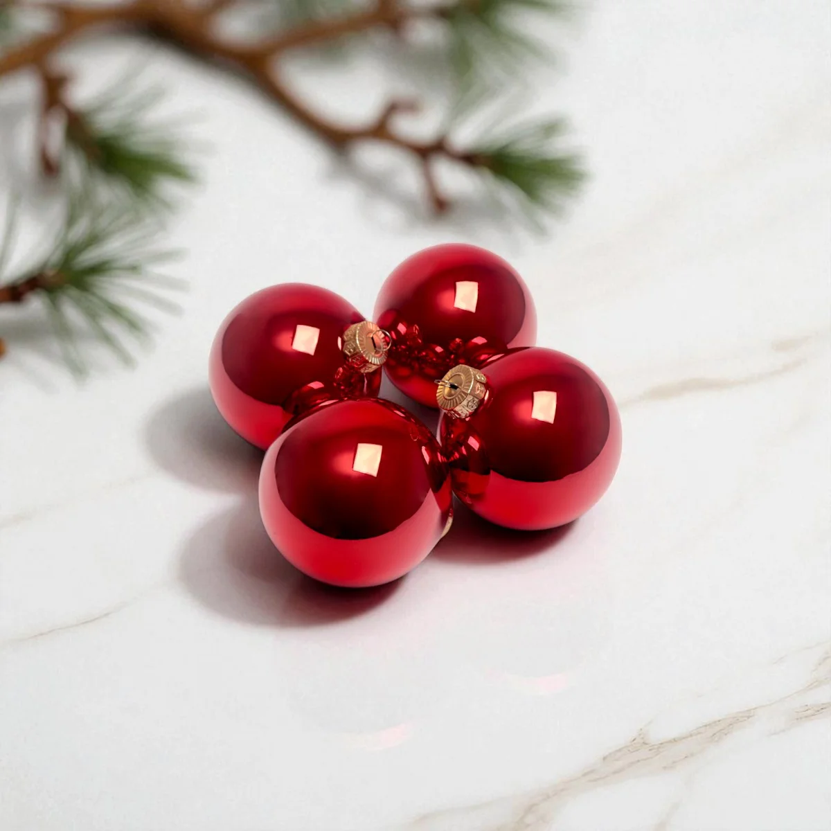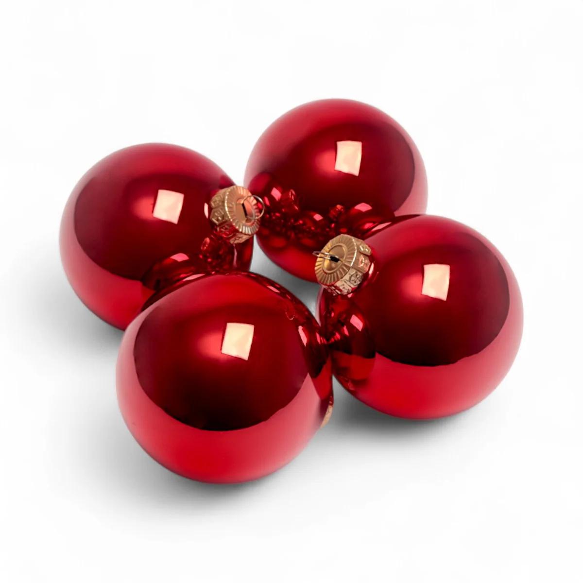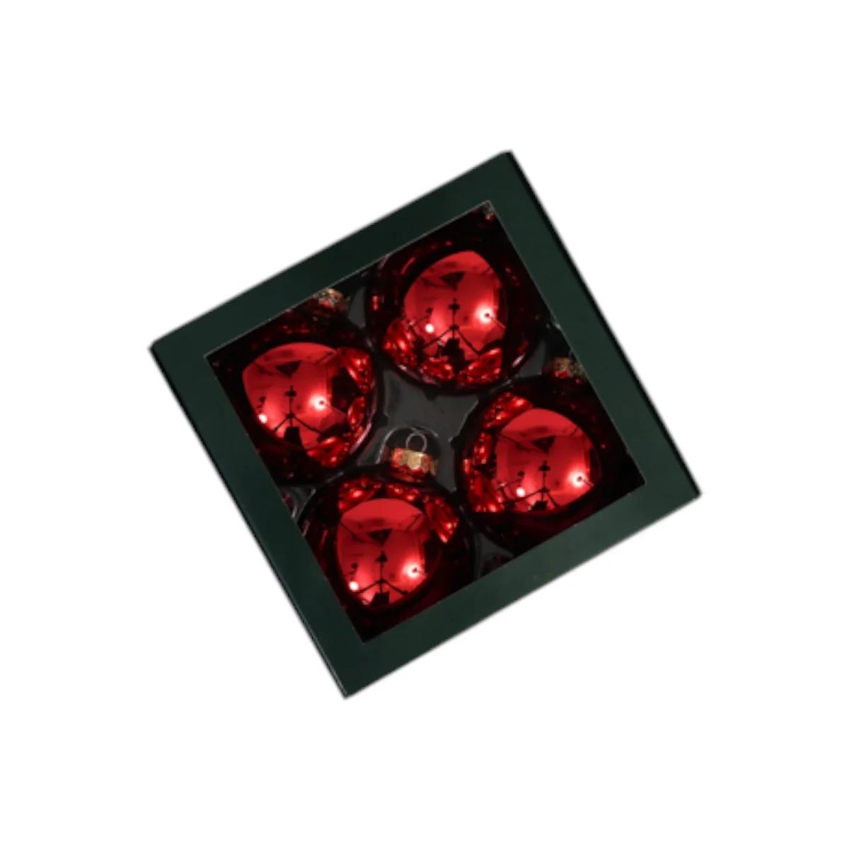 Czerwone, błyszczące bombki szklane o średnicy 10cm. Bombki wykonane z wysokiej jakości szkła, pakowane po 4 sztuki. Bardzo dobrze prezentują się na dużej świątecznej dekoracji. Idealnie sprawdzą się jako dekoracja choinki lub girlandy. Wszystkie bombki posiadają uchwyty do zawieszenia i zapakowane są w estetyczny kartonik ułatwiający przechowywanie.