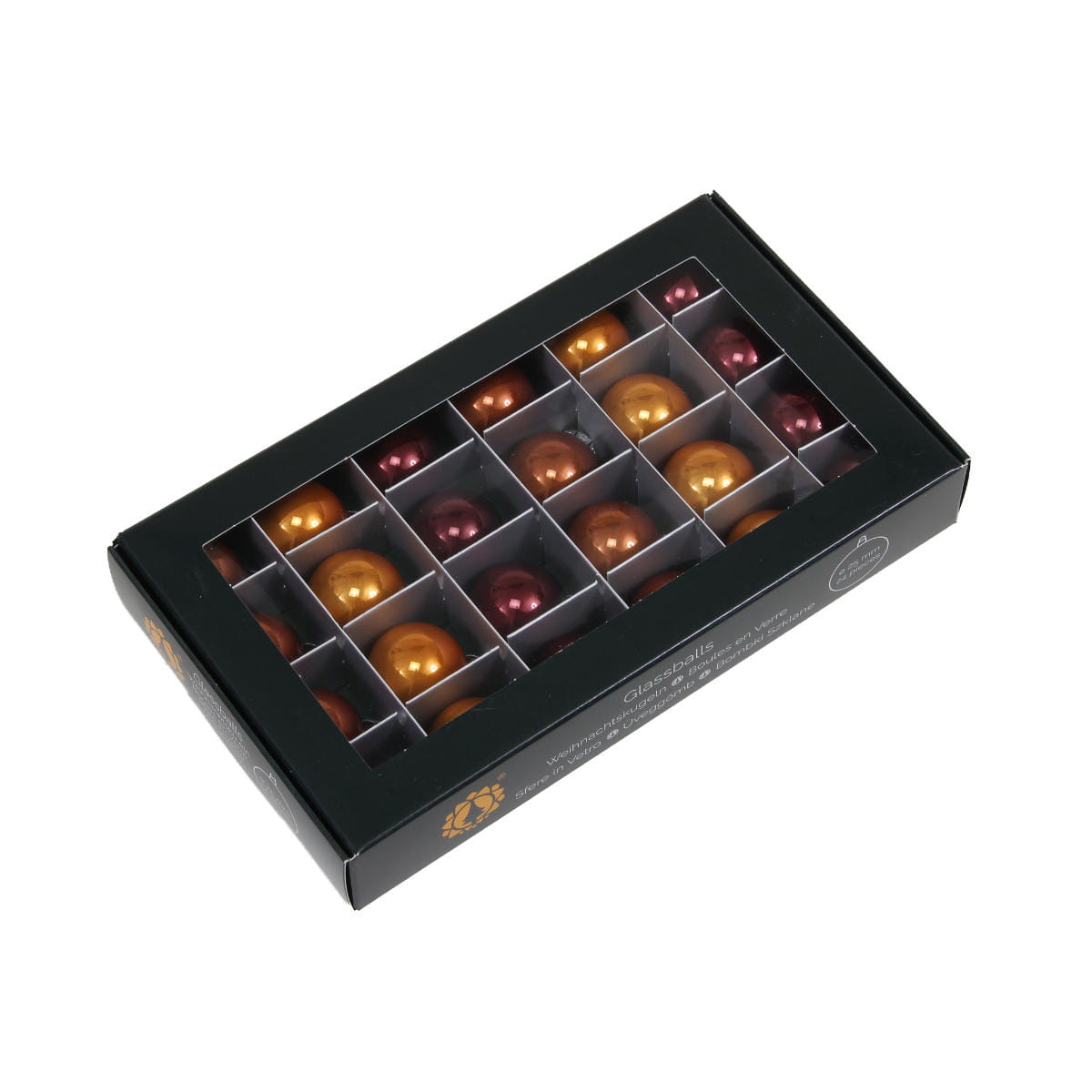 Komplet małych szklanych bombek. W zestawie znajdują się błyszczące bombki, w dwóch odcieniach koloru brązowego oraz bombki w kolorze karmelowo-pomarańczowym. Bombki o średnicy 25mm, idealnie nadają się do ozdoby wianków, girland, stroików oraz świątecznych koszy prezentowych. Bombki zapakowane są w estetyczny kartonik z celofanowym okienkiem.