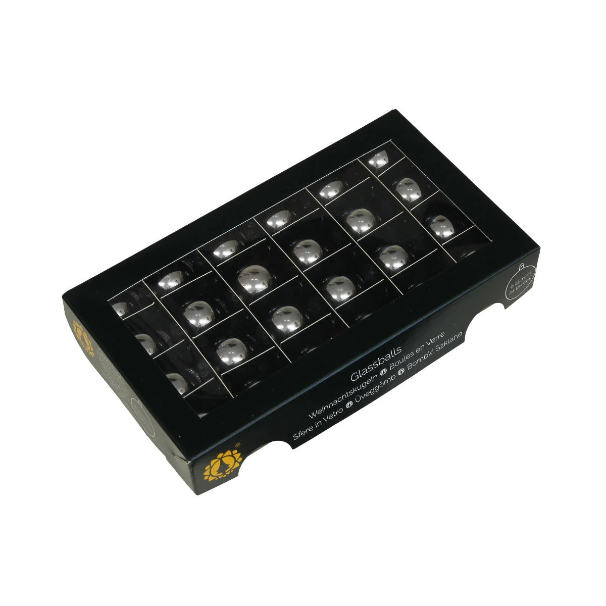 Komplet srebrnych, błyszczących bombek szklanych na choinkę. Wszystkie 24 sztuki bombek w zestawie są jednakowe. Ich rozmiar powoduje, że doskonale nadadzą się do ozdoby wianków, girland, stroików oraz świątecznych koszy prezentowych. Bombki zapakowane są w estetyczny, czarny kartonik z celofanowym okienkiem.
