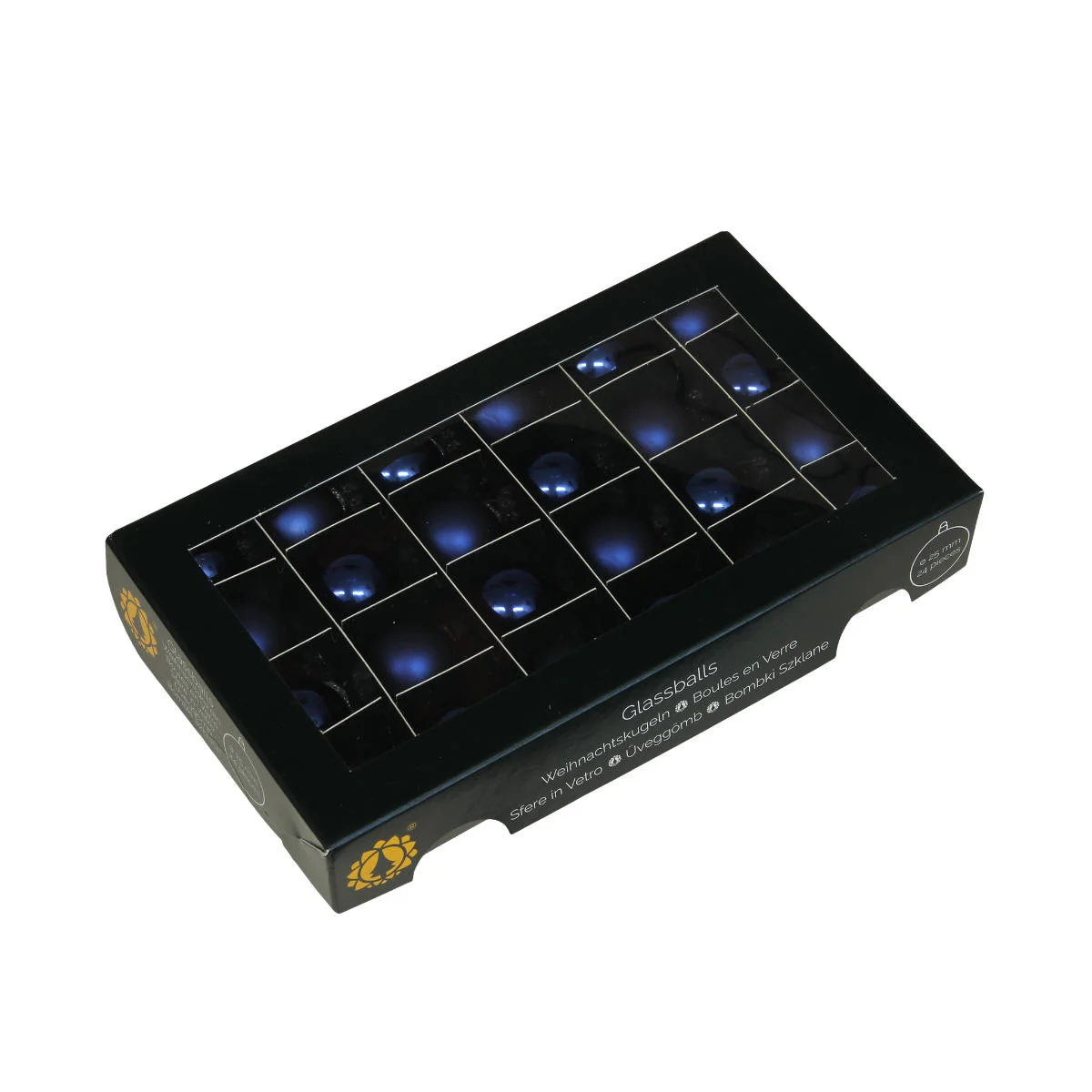 Komplet małych bombek szklanych na choinkę. Komplet zawiera 24 bombki, matowe oraz błyszczące, w kolorze granatowym. Idealnie nadają się do ozdoby wianków, girland, stroików oraz świątecznych koszy prezentowych. Bombki zapakowane są w estetyczny, czarny kartonik z celofanowym okienkiem.