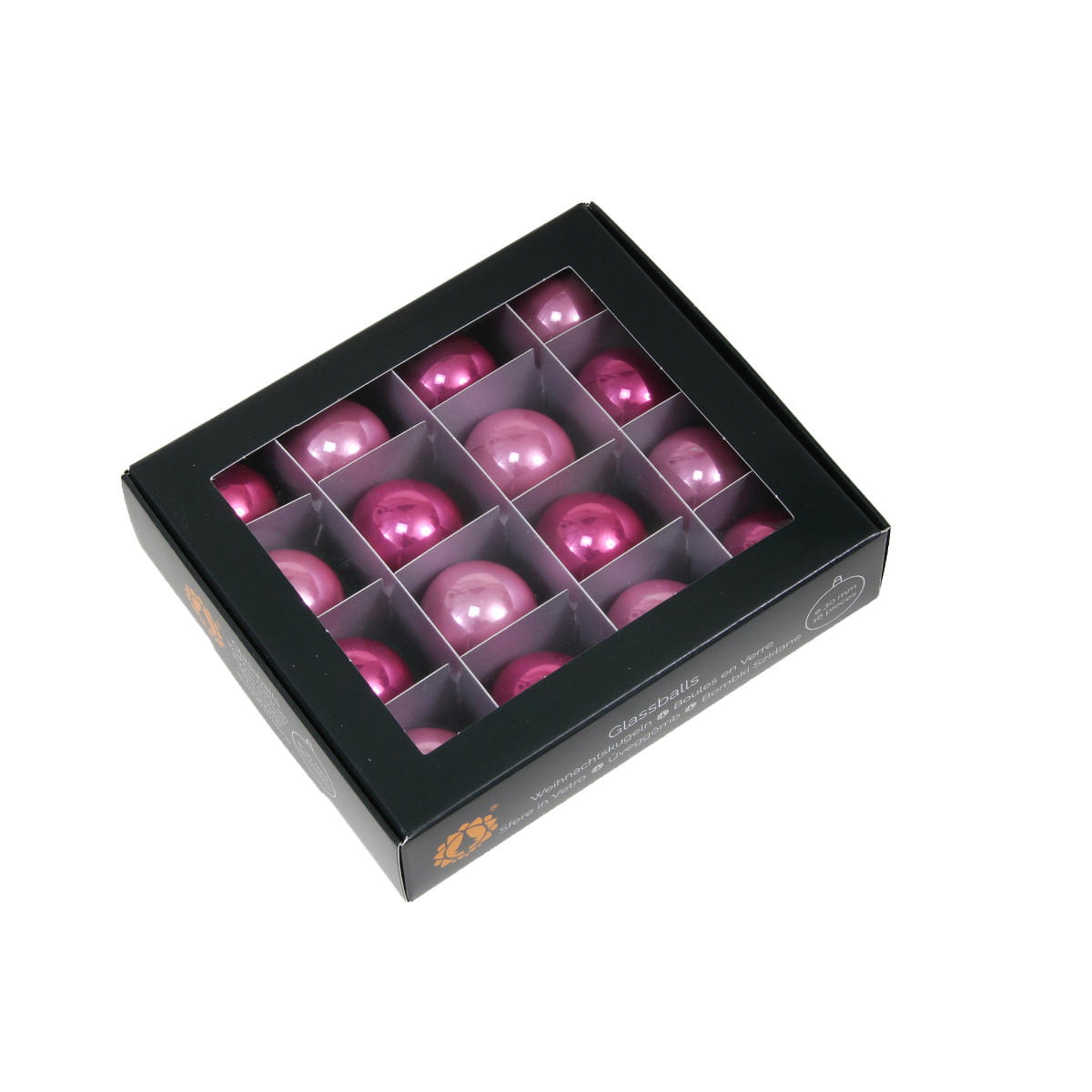 Zestaw różowych bombek szklanych na choinkę. W komplecie znajduje się 16 sztuk, w dwóch odcieniach koloru różowego. Wszystkie posiadają opalizującą poświatę. Ich rozmiar powoduje, że doskonale nadają się do ozdoby wianków, girland, stroików oraz świątecznych koszy prezentowych. Bombki zapakowane są w estetyczny, czarny kartonik z celofanowym okienkiem.