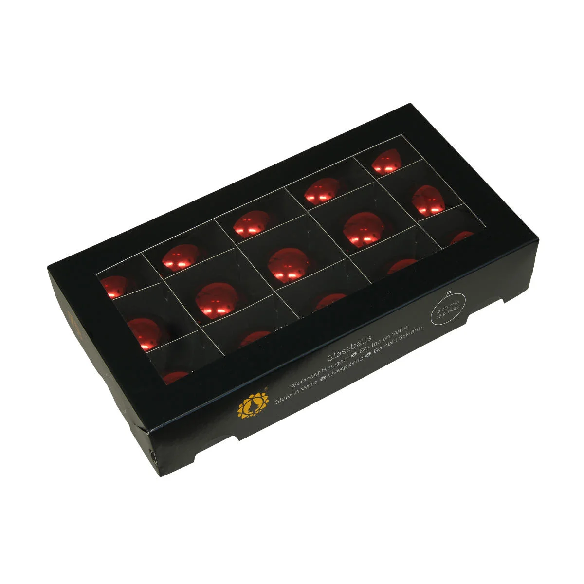 Komplet szklanych bombek o średnicy 40mm. W zestawie znajduje się 15 sztuk czerwonych bombek, z błyszczącym wykończeniem. Bombki idealnie nadają się do ozdoby wianków, girland, stroików oraz świątecznych koszy prezentowych. Zapakowane są w estetyczny, czarny kartonik z celofanowym okienkiem.