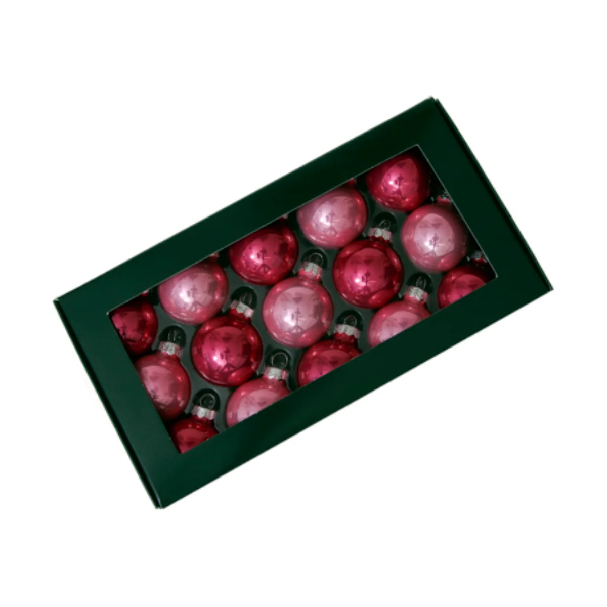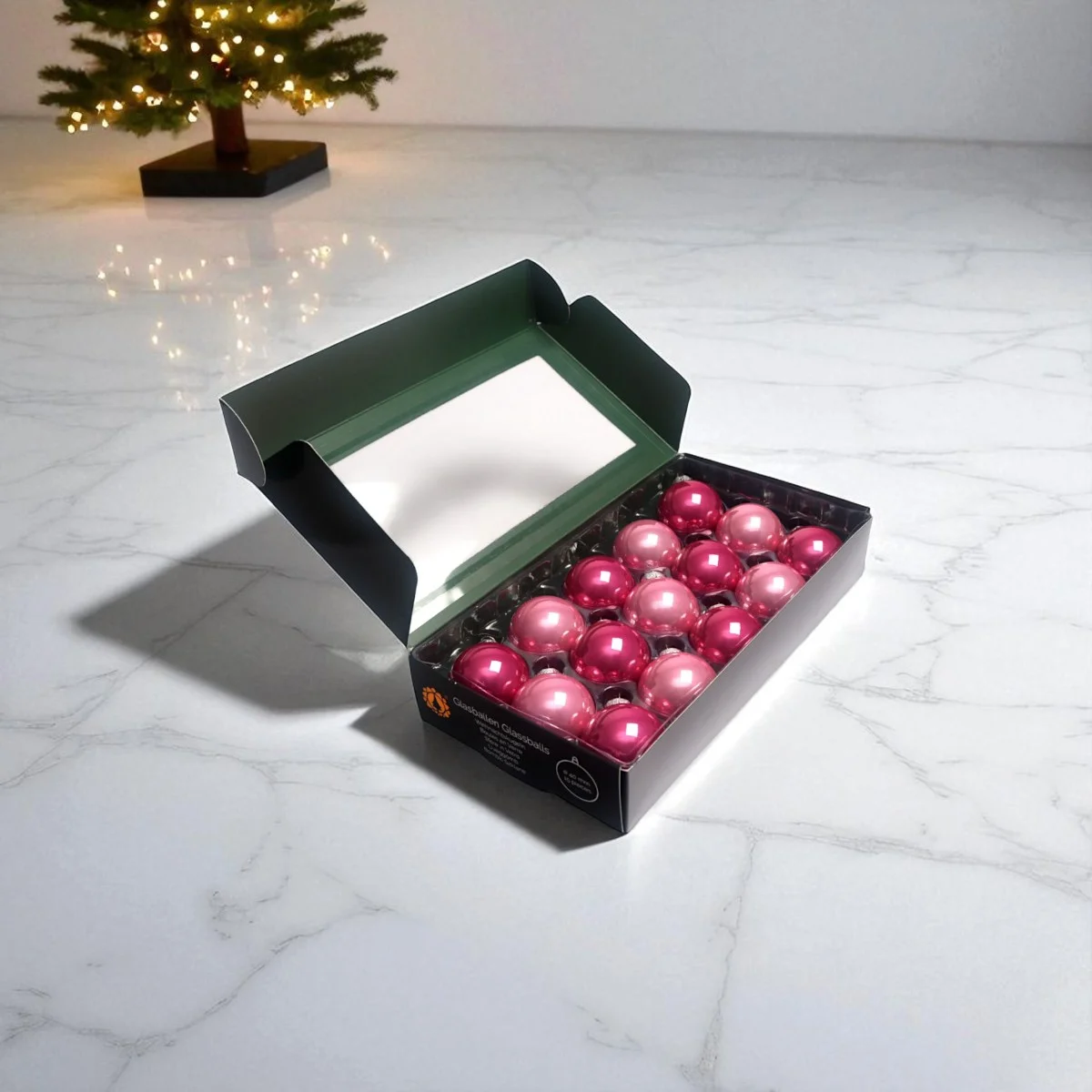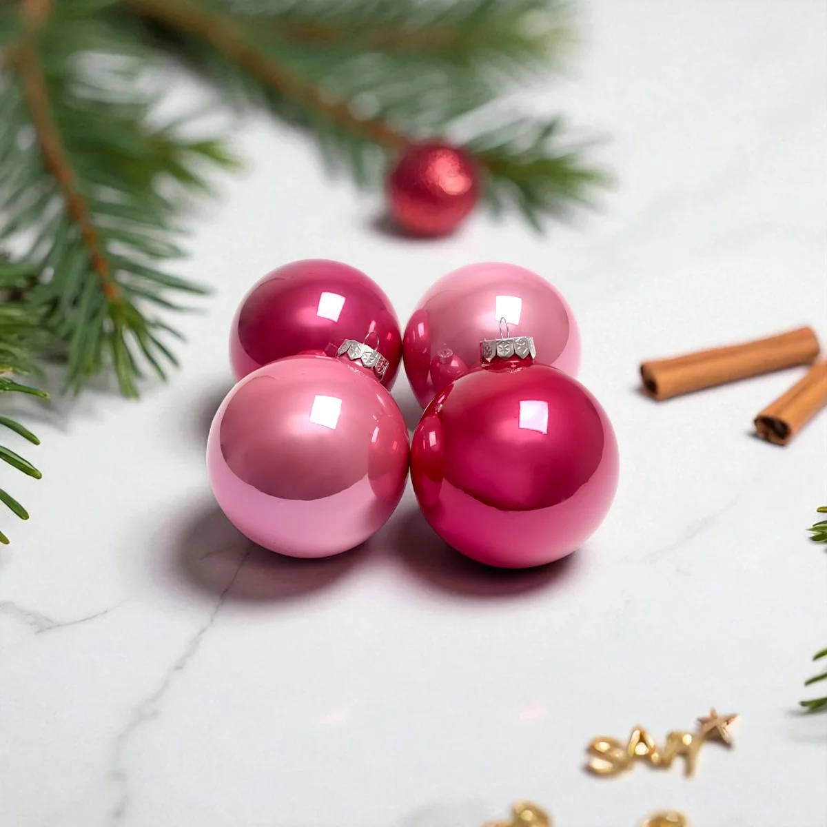 Różowe opalizujące bombki szklane na choinkę. Bombki w komplecie 15 sztuk, w dwóch odcieniach koloru różowego z opalizującą poświatą. Doskonale nadają się do ozdoby wianków, girland, stroików oraz świątecznych koszy prezentowych. Bombki zapakowane są w estetyczny kartonik z celofanowym okienkiem.