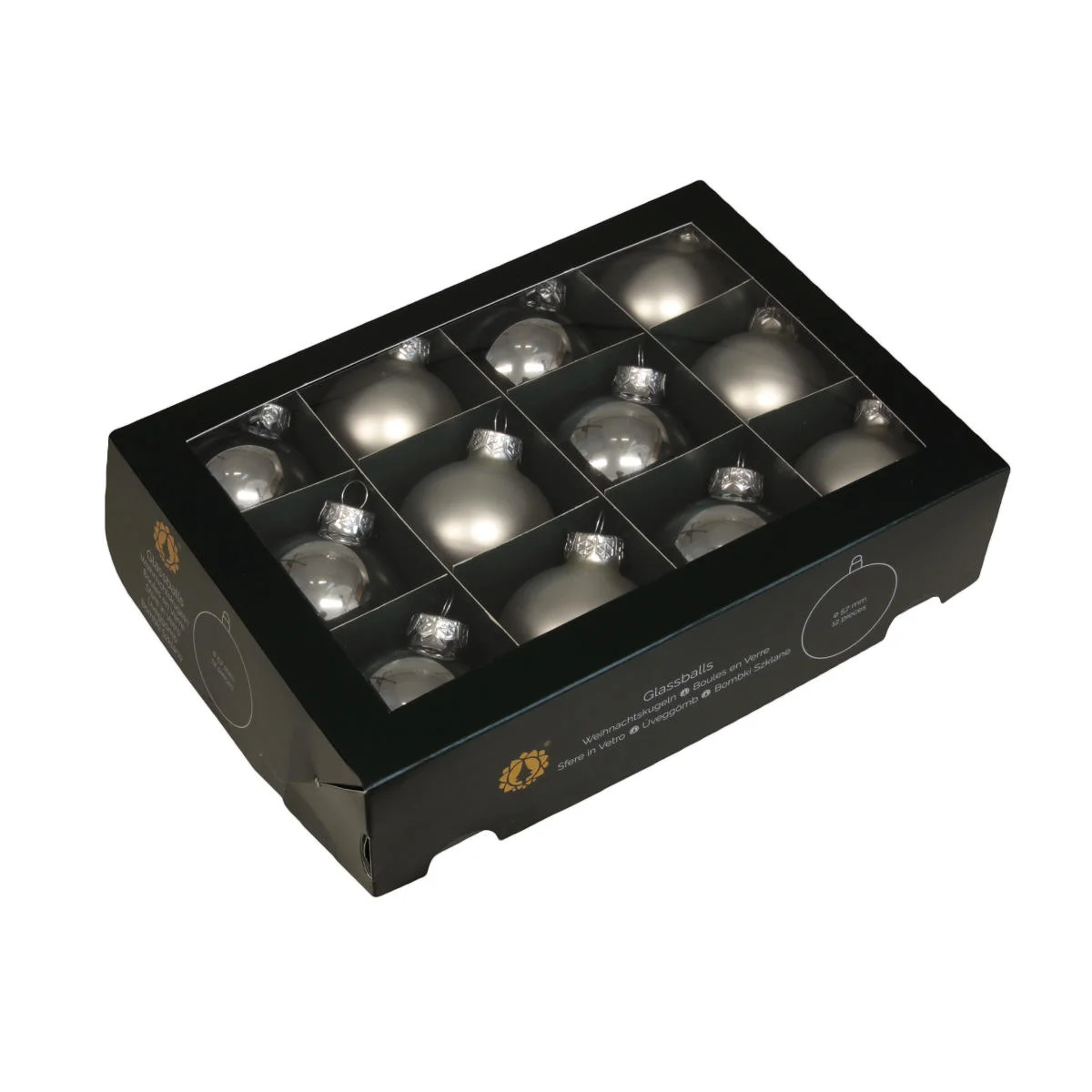 Srebrne, szklane bombki z wysokiej jakości szkła, pakowane po 12 sztuk. Bombki mają średnicę 57cm, co powoduje, że dobrze zaprezentują się w każdej wielkości świątecznej dekoracji. W komplecie znajdują się bombki szklane w wersji matowej i błyszczącej. Idealnie sprawdzą się jako dekoracja choinki lub girlandy. Wszystkie bombki posiadają uchwyty do zawieszenia i zapakowane są w estetyczny kartonik ułatwiający przechowywanie.